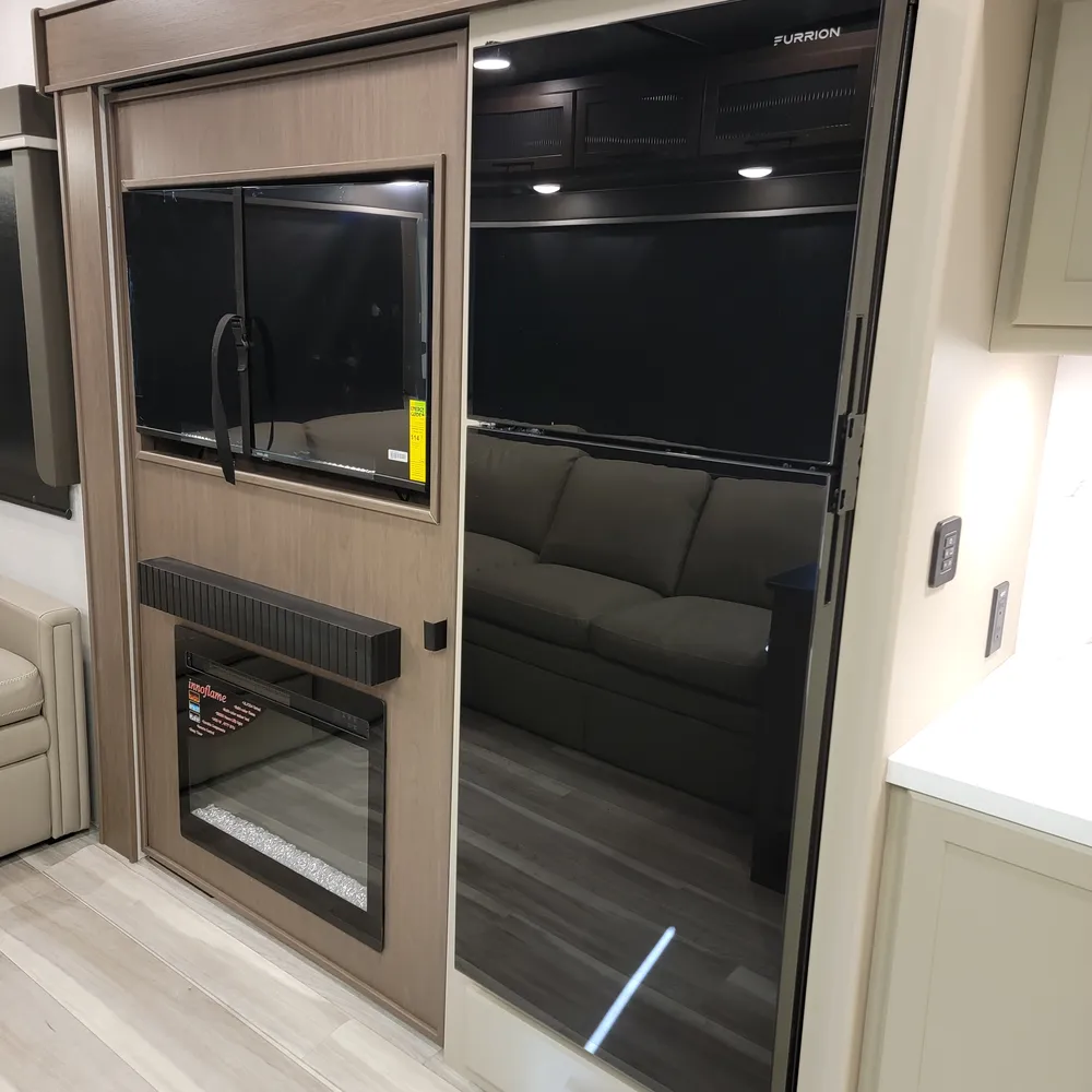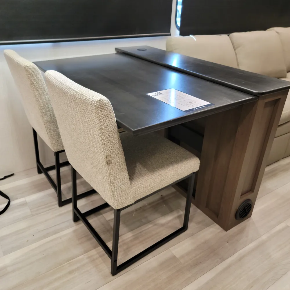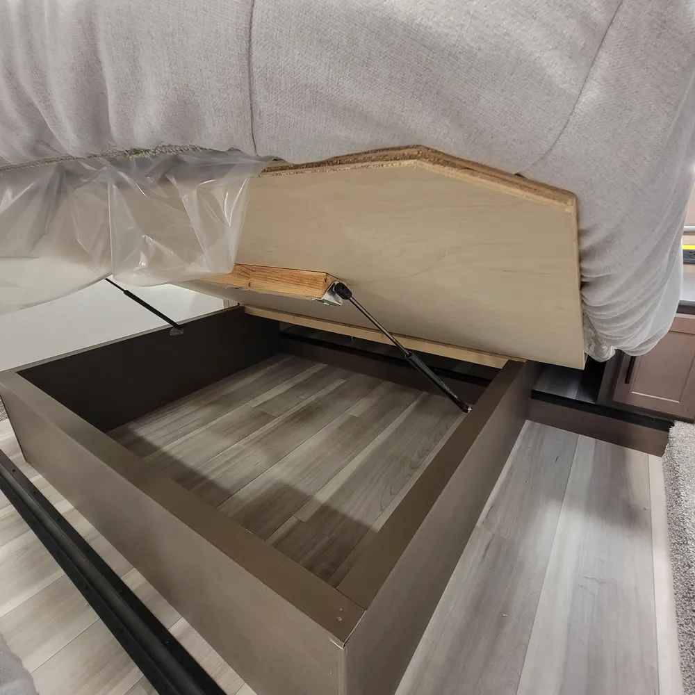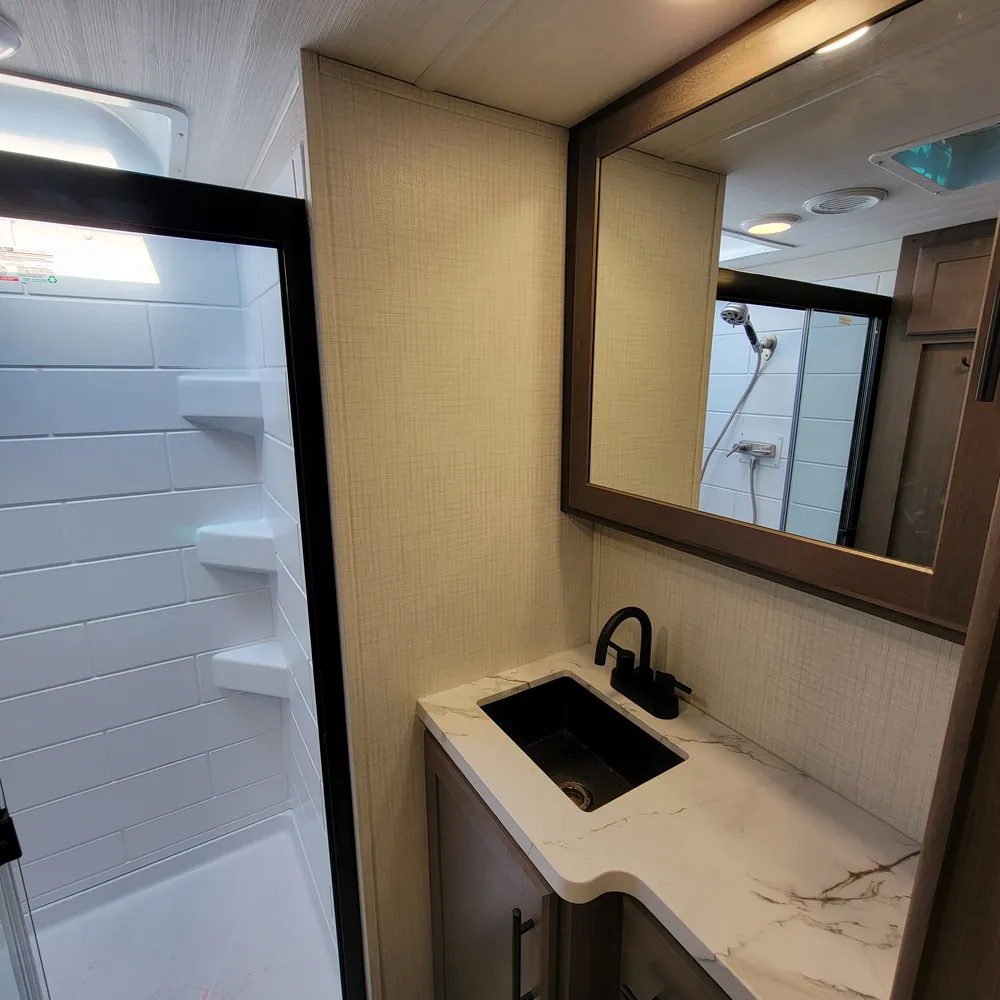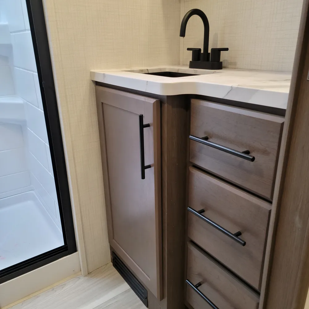 The 2026 Keystone Cougar Half-Ton 26RES is a popular choice for both short trips and extended stays. It offers a front private bedroom with a king bed, a large slide-out with an L-shaped sectional sofa, and a full bathroom. The 26RES also boasts a 18′ power awning, a hidden pantry behind the entertainment center, and a pivot dinette with two extra chairs.