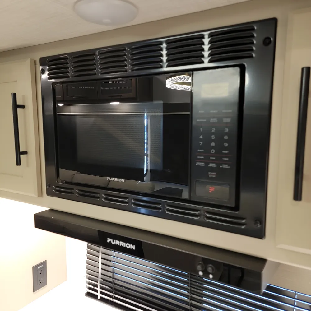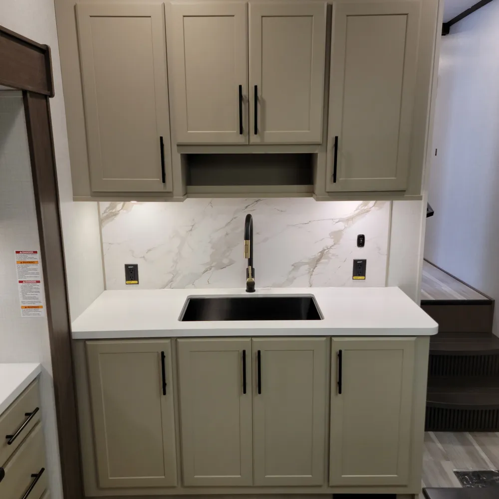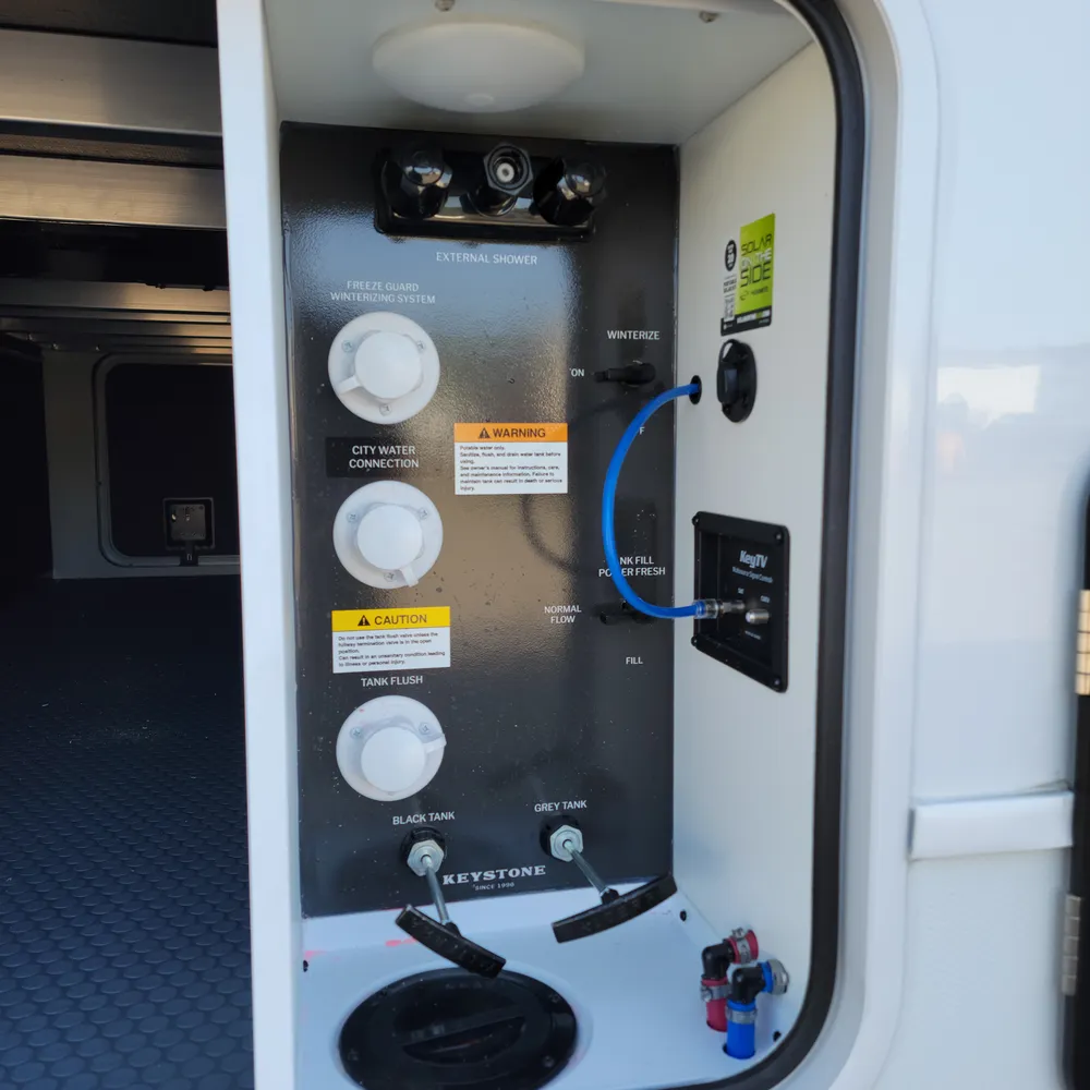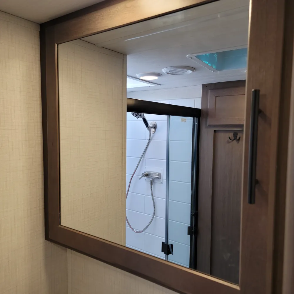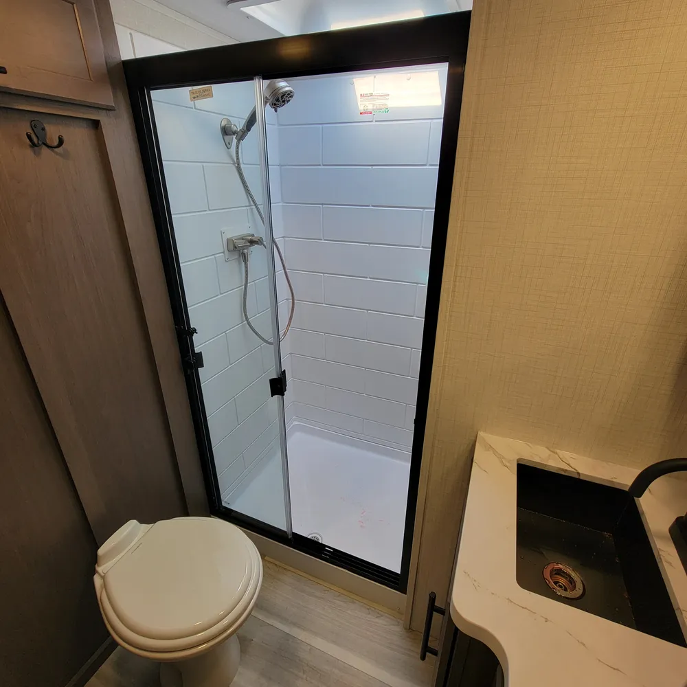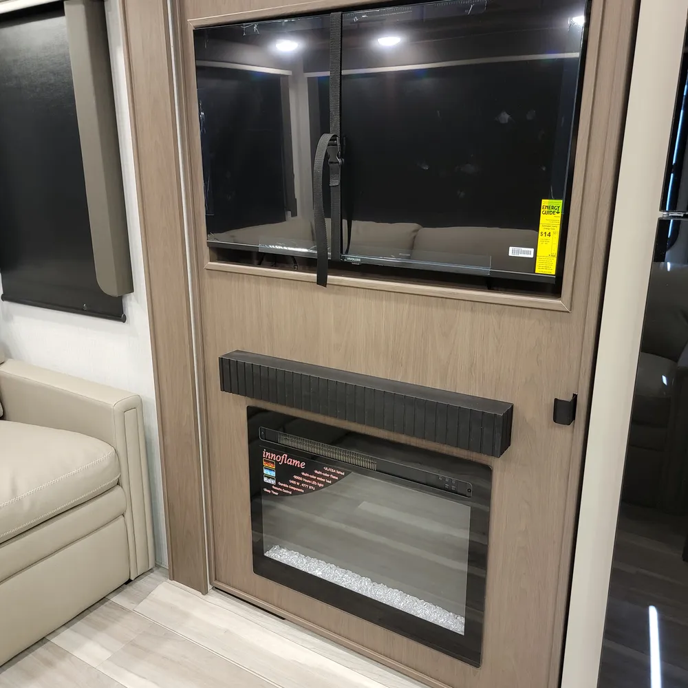 The 2026 Keystone Cougar Half-Ton 26RES is a popular choice for both short trips and extended stays. It offers a front private bedroom with a king bed, a large slide-out with an L-shaped sectional sofa, and a full bathroom. The 26RES also boasts a 18′ power awning, a hidden pantry behind the entertainment center, and a pivot dinette with two extra chairs.