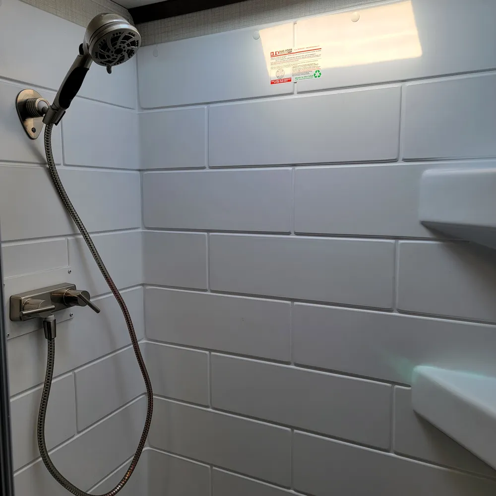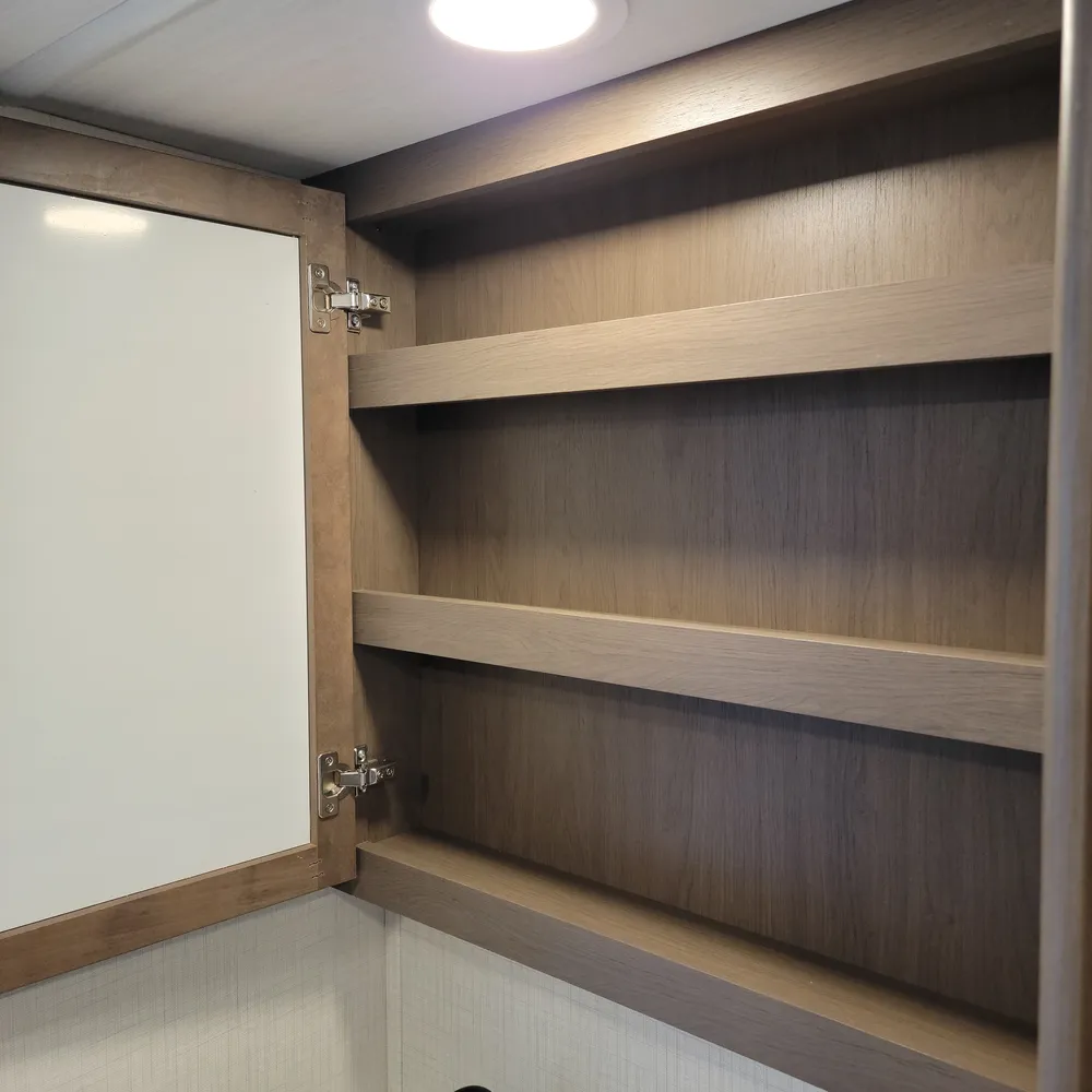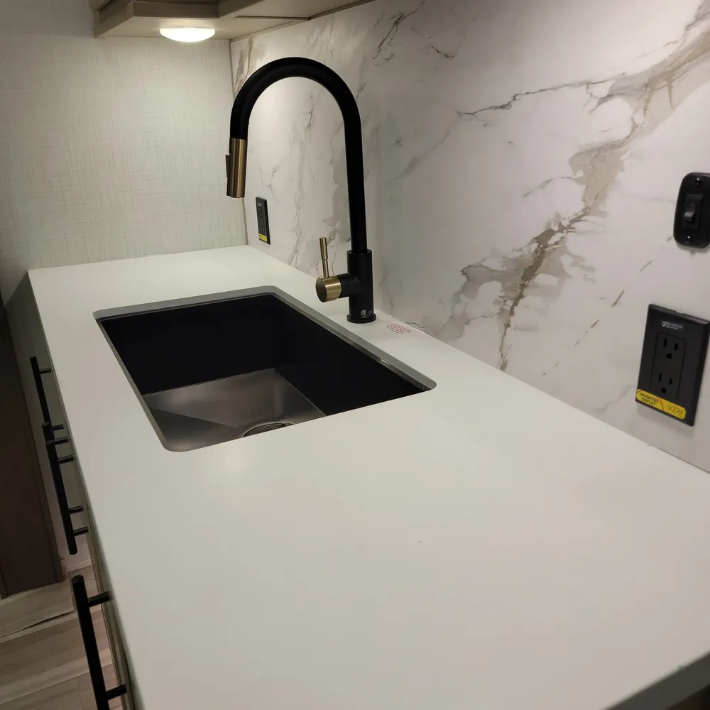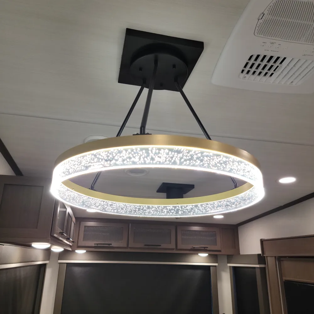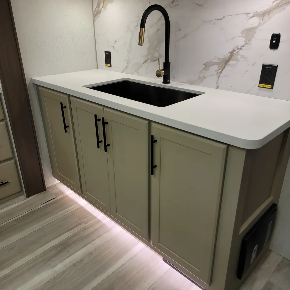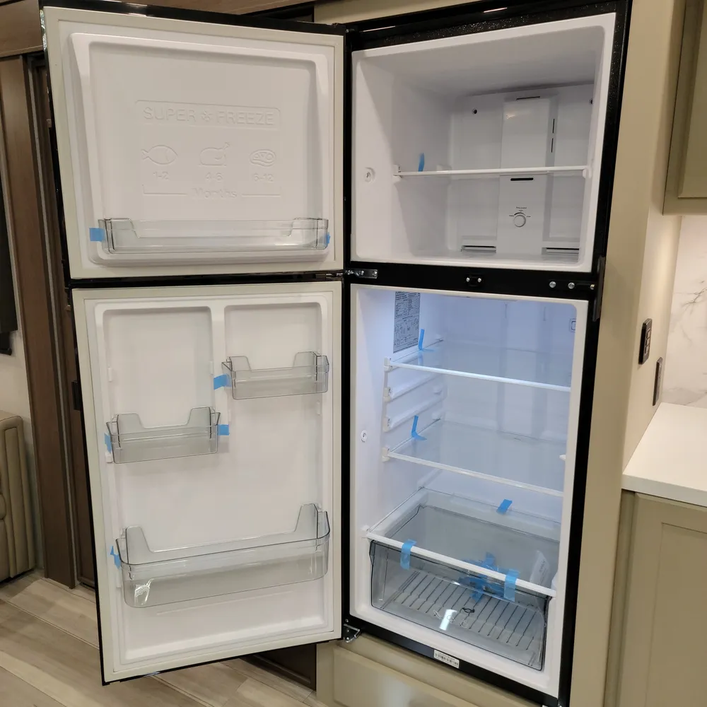The 2026 Keystone Cougar Half-Ton 26RES is a popular choice for both short trips and extended stays. It offers a front private bedroom with a king bed, a large slide-out with an L-shaped sectional sofa, and a full bathroom. The 26RES also boasts a 18′ power awning, a hidden pantry behind the entertainment center, and a pivot dinette with two extra chairs.