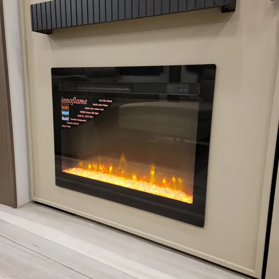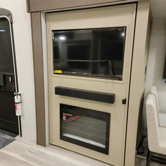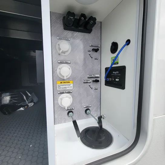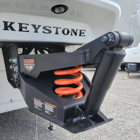 The 2026 Keystone Cougar Half-Ton 26RKE features a large front pass-through storage area, two awnings, and an outdoor entertainment center with an LED TV and refrigerator. The 26RKE includes Hyper Core composite sidewalls, eliminating wood from the walls, and a Climate Guard package.