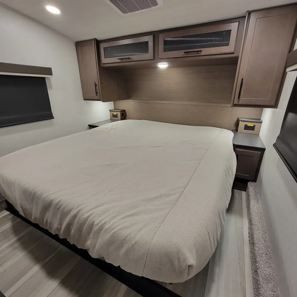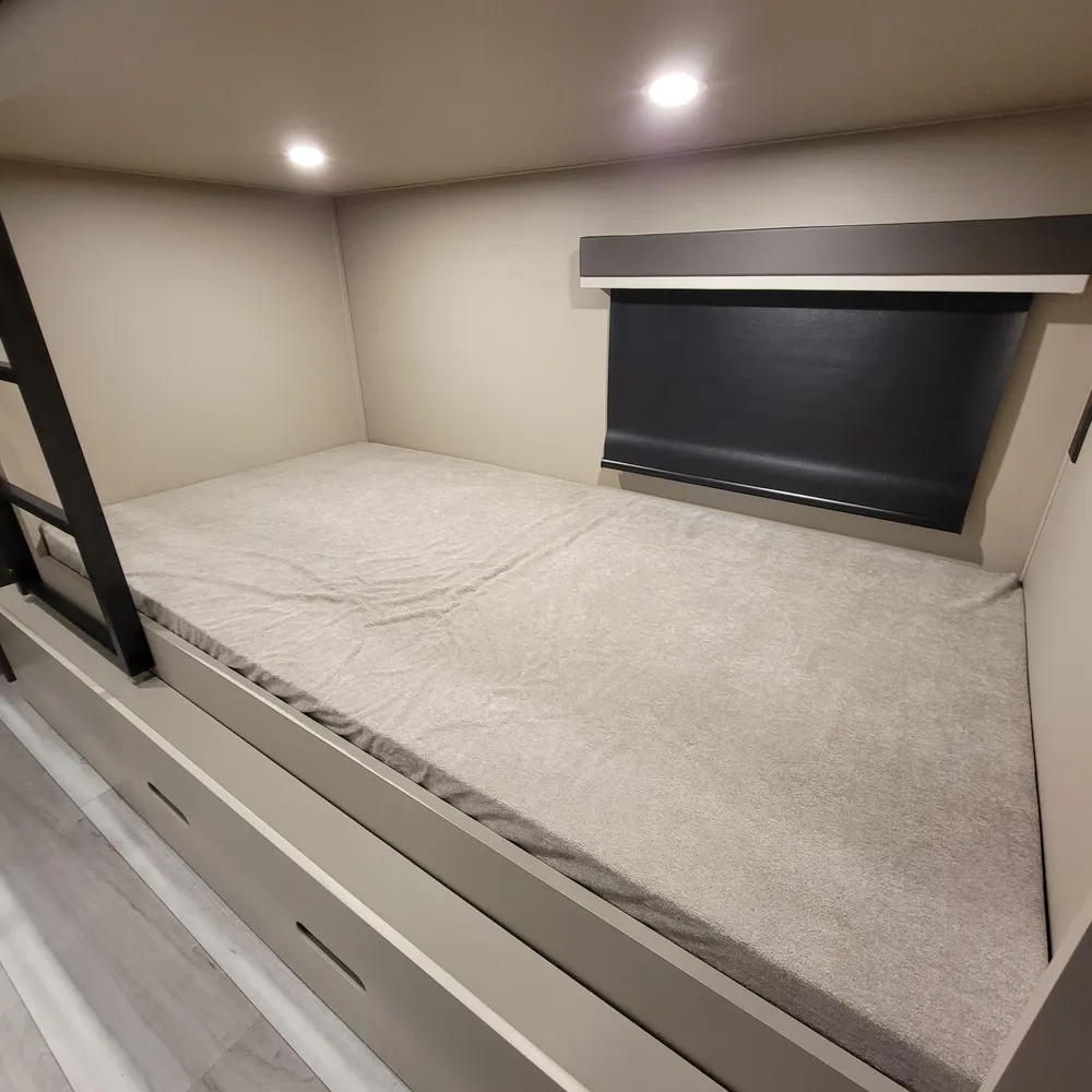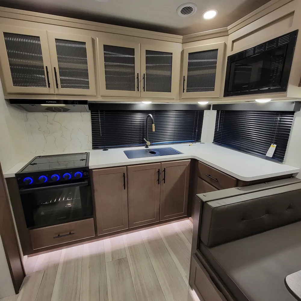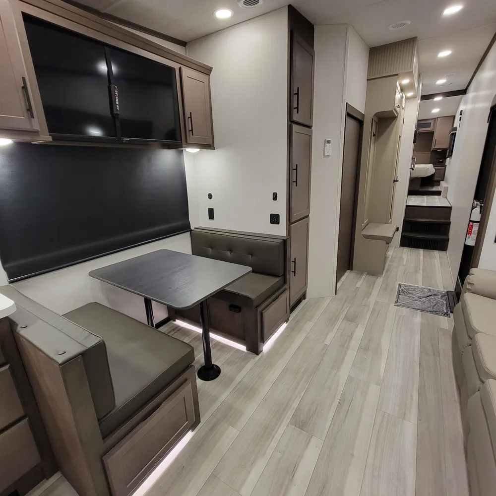 The 29MBD features a unique mid-bunk layout, and a master bedroom with a king bed in the front. The rear kitchen puts the galley at the back of the coach with a 10.4-cubic-foot 12-volt refrigerator, 21-inch Furrion range and a booth dinette seats the family for meals.