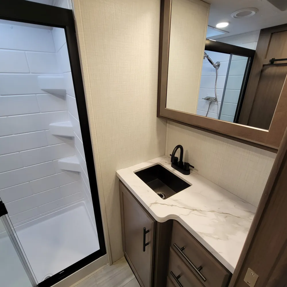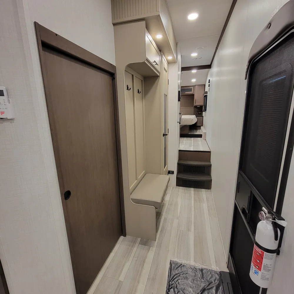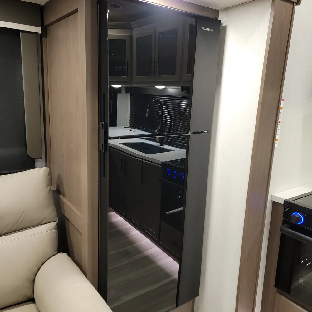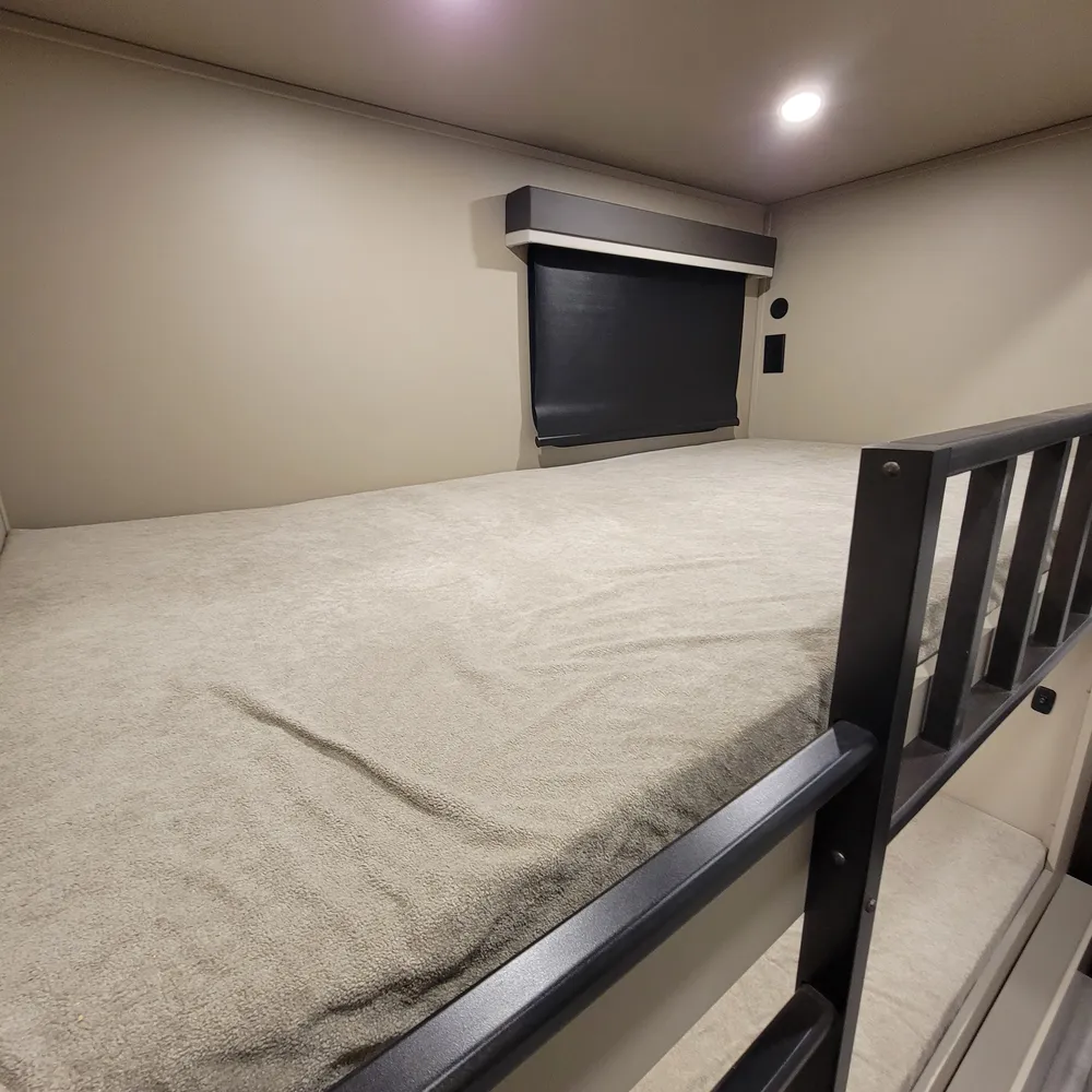 The 29MBD features a unique mid-bunk layout, and a master bedroom with a king bed in the front. The rear kitchen puts the galley at the back of the coach with a 10.4-cubic-foot 12-volt refrigerator, 21-inch Furrion range and a booth dinette seats the family for meals.