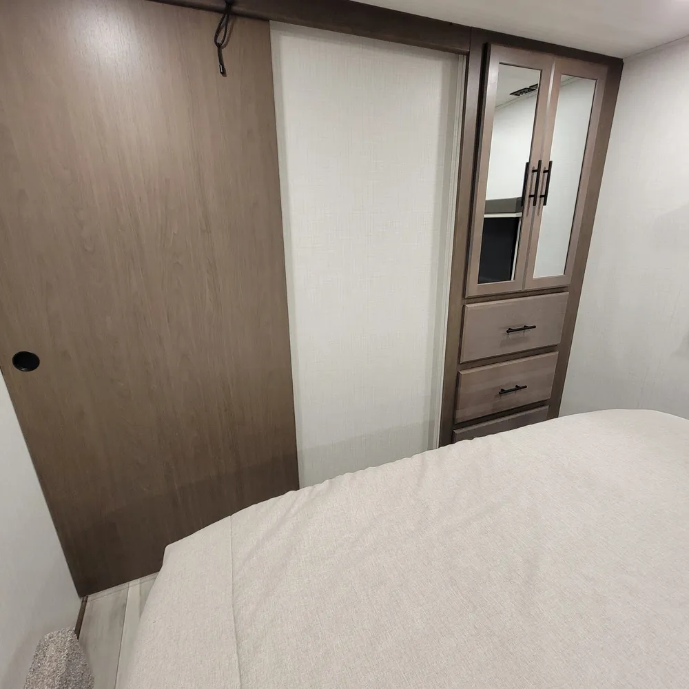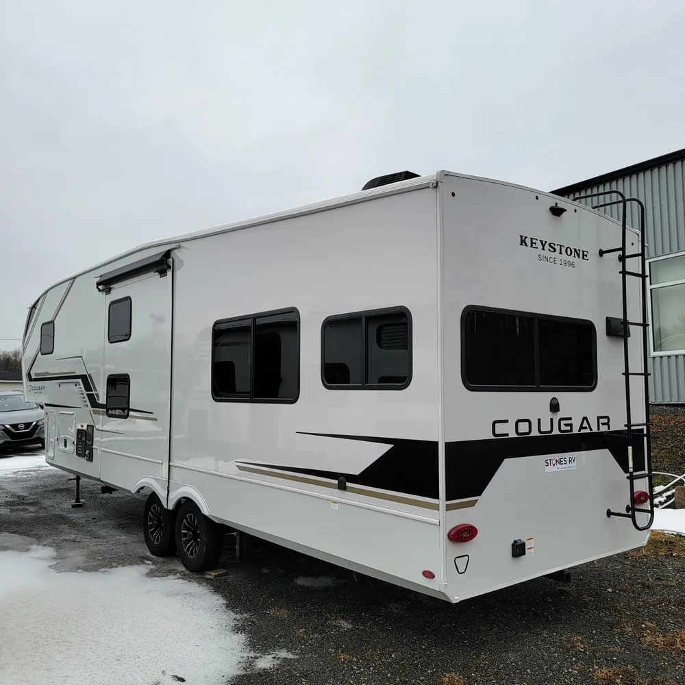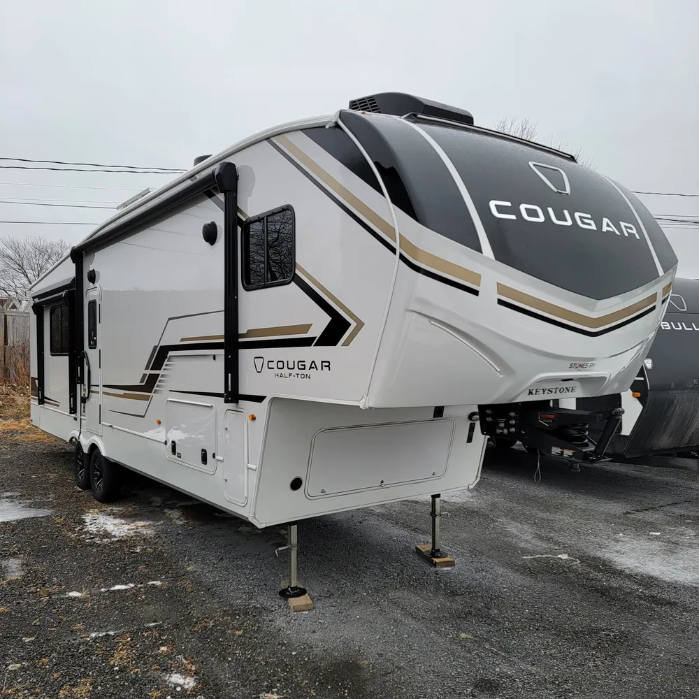 The 2026 Keystone Cougar Half-Ton 29MBD fifth wheel has arrived at our New Glasgow dealership. This 34-foot fifth wheel sleeps up to 10 people and weighs 9235 pounds dry with a 1635 pound pin weight.