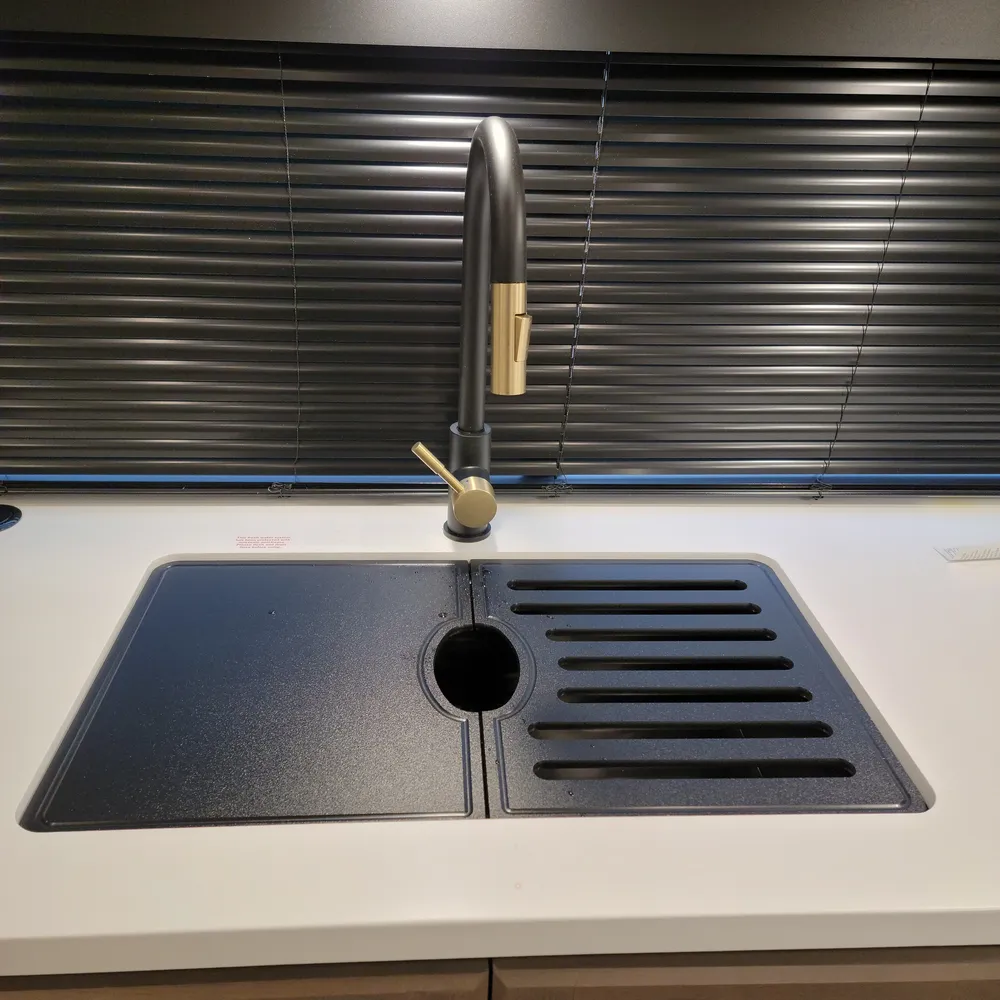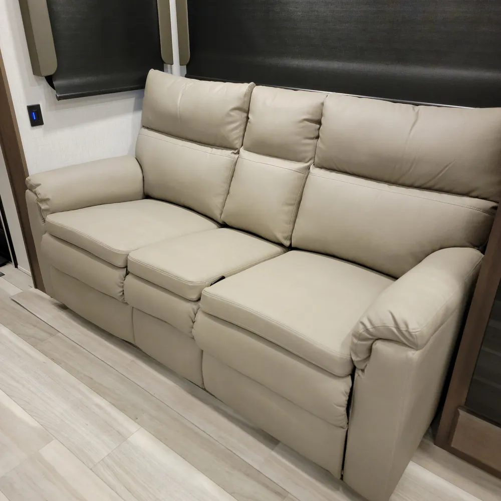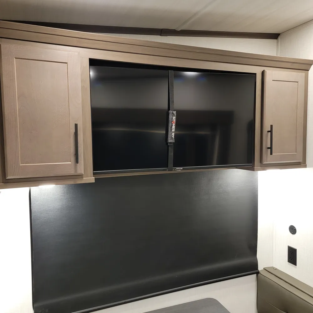 Keystone equipped this Cougar with a tankless water heater, and dual 18,000 BTU and 15,000 BTU air conditioning units. Two electric awnings with LED lighting extend the living space outside. The rig carries 54 gallons of fresh water with 60 gallon grey and 30 gallon black tanks.