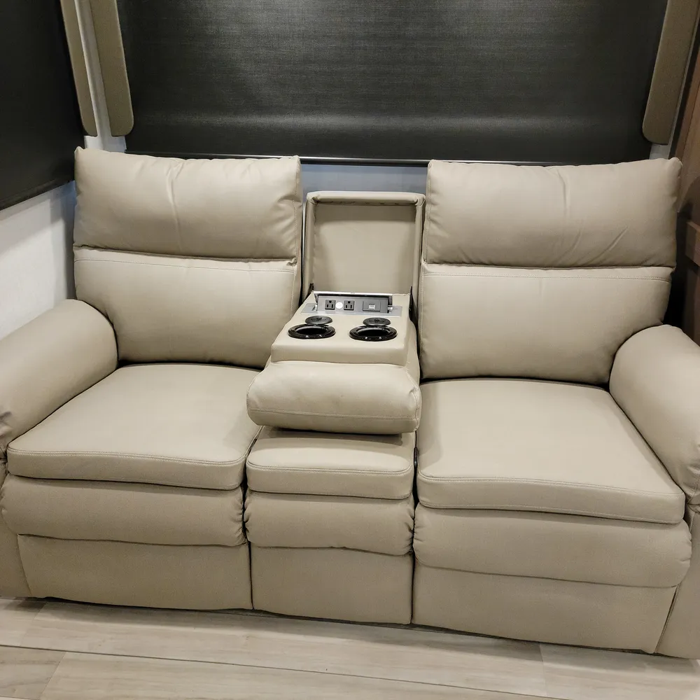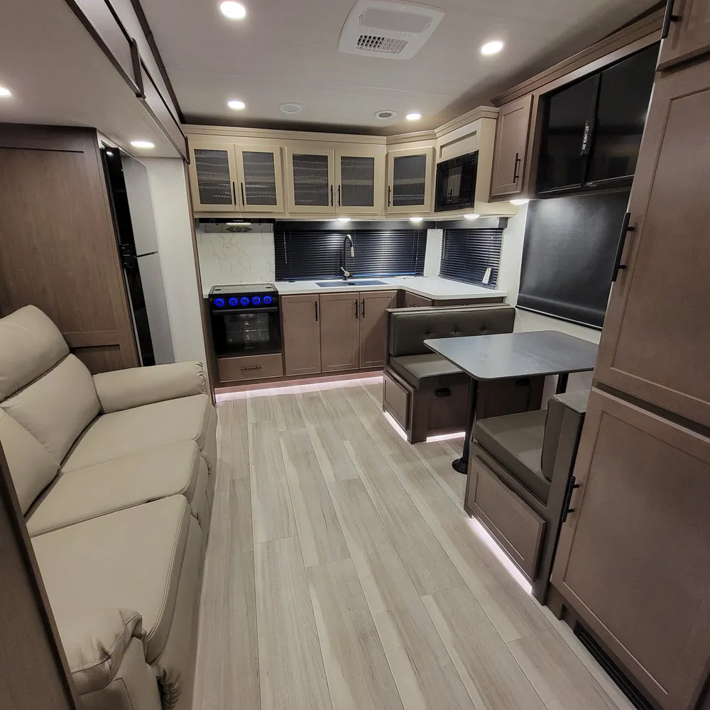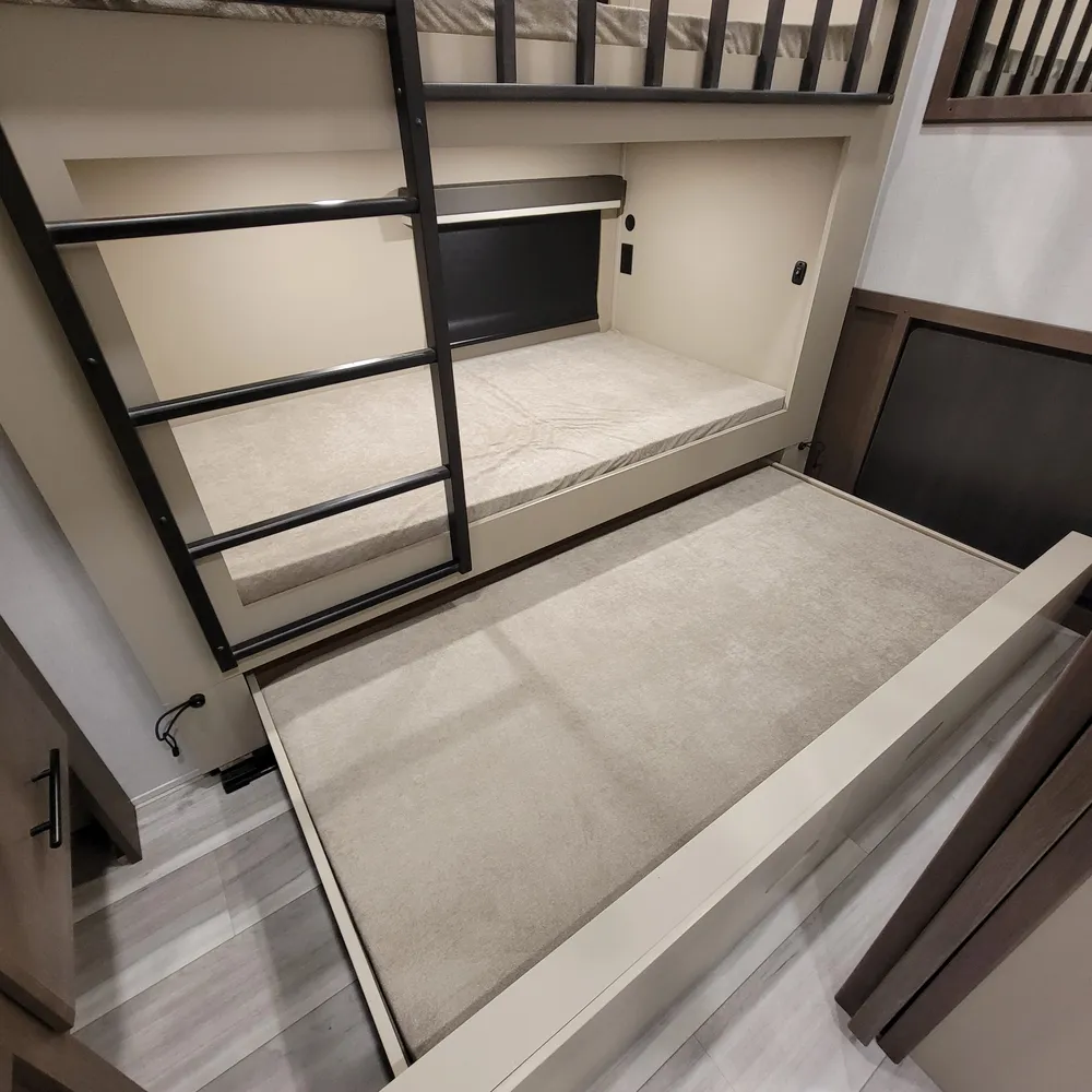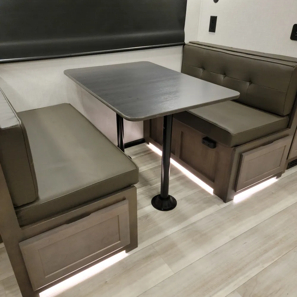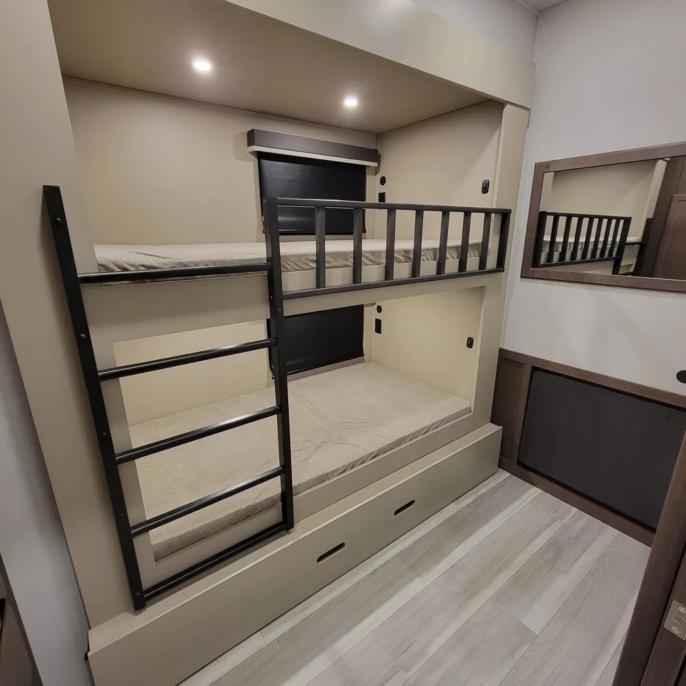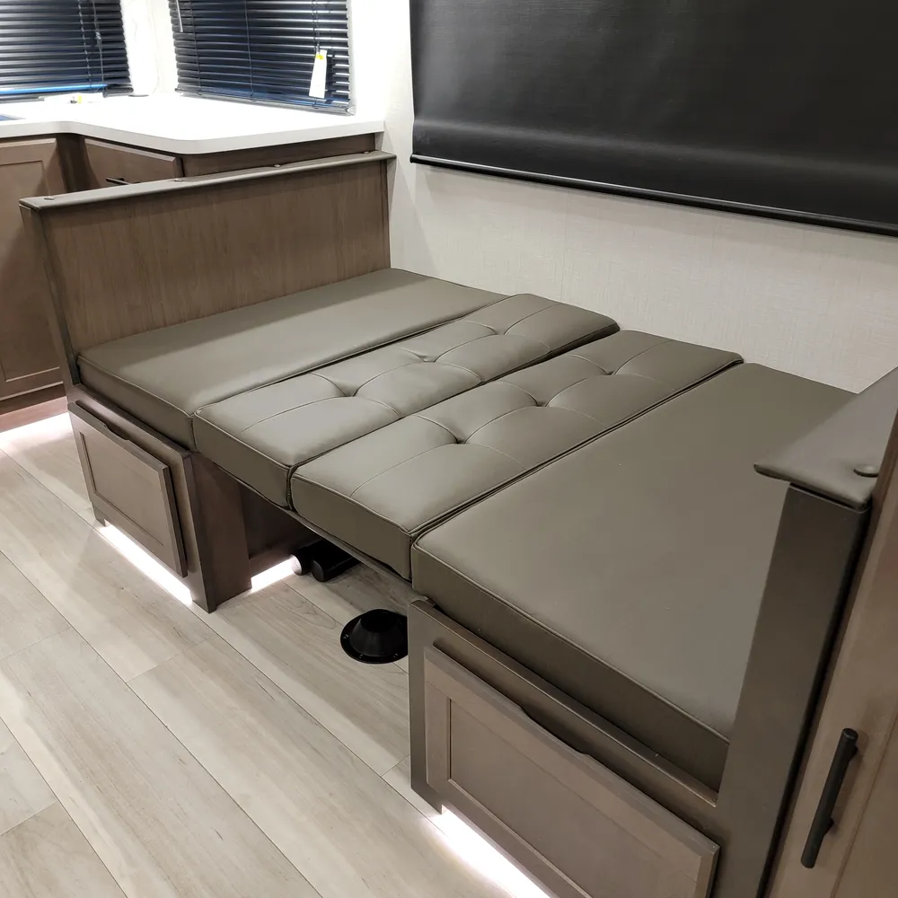 The mid-section features a completely redesigned double mid-bunk setup that maximizes sleeping space for kids or guests. The living area offers a booth dinette with drawer storage and accent lighting. along with theater seating that provides comfortable lounging space.