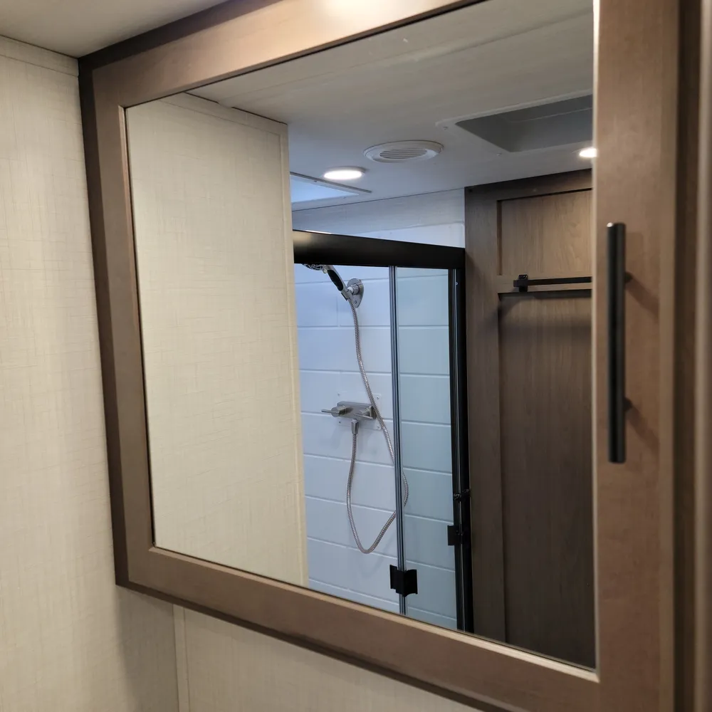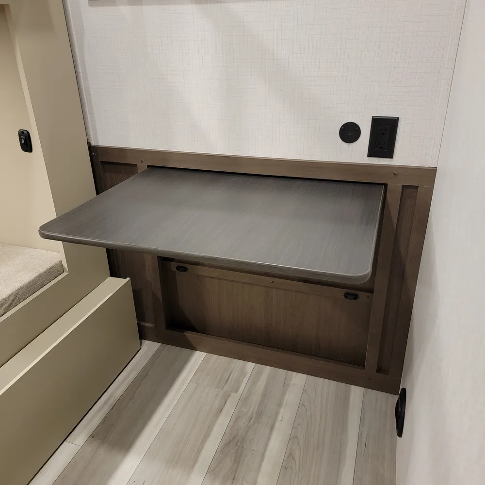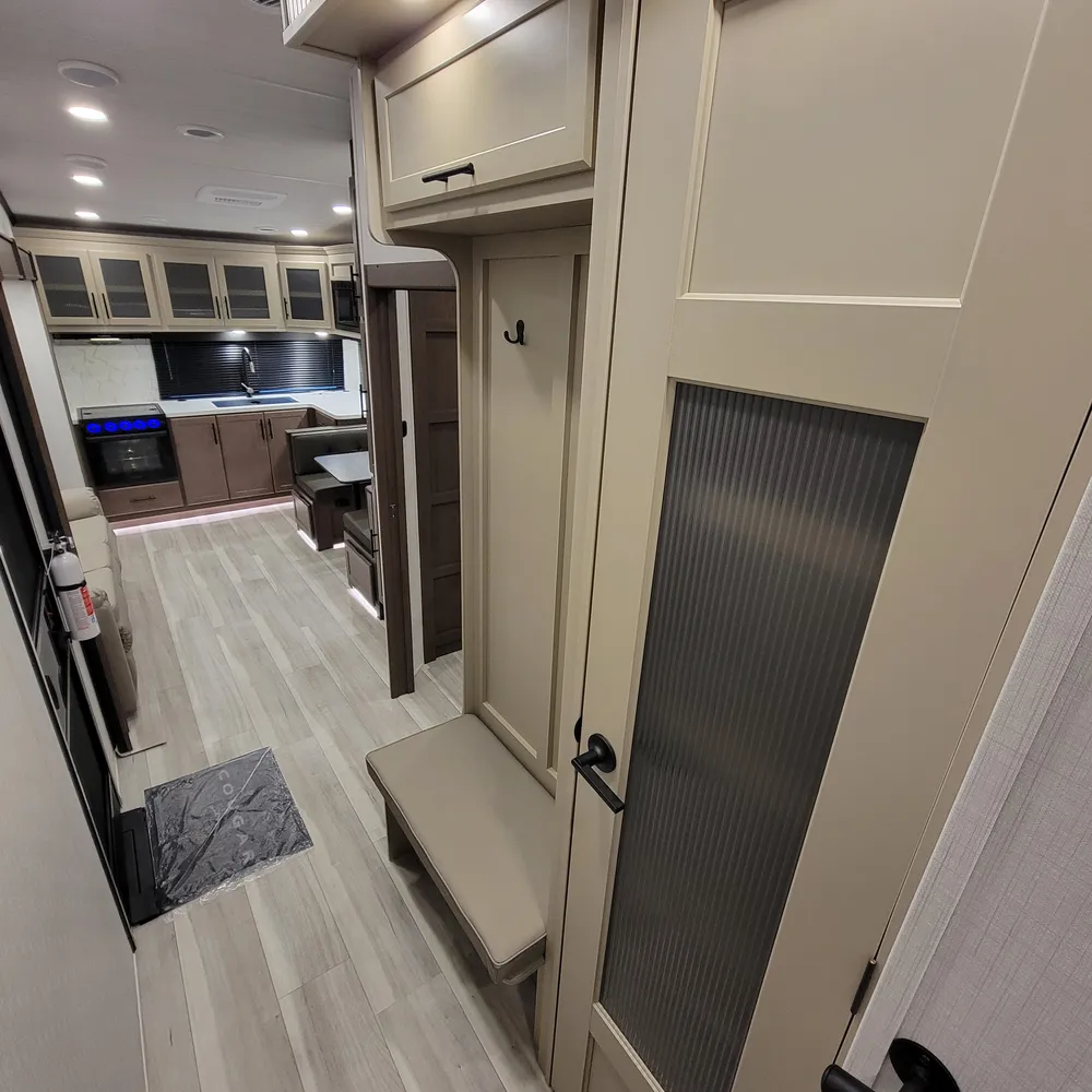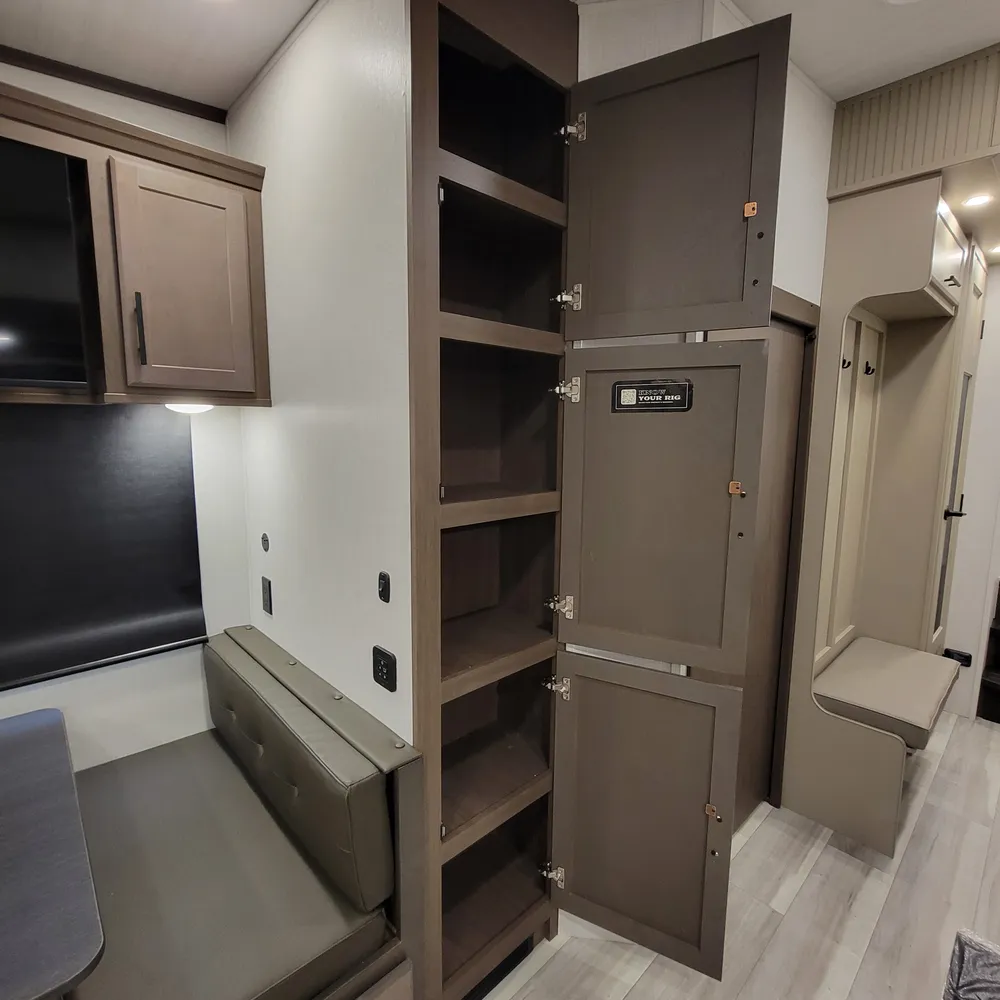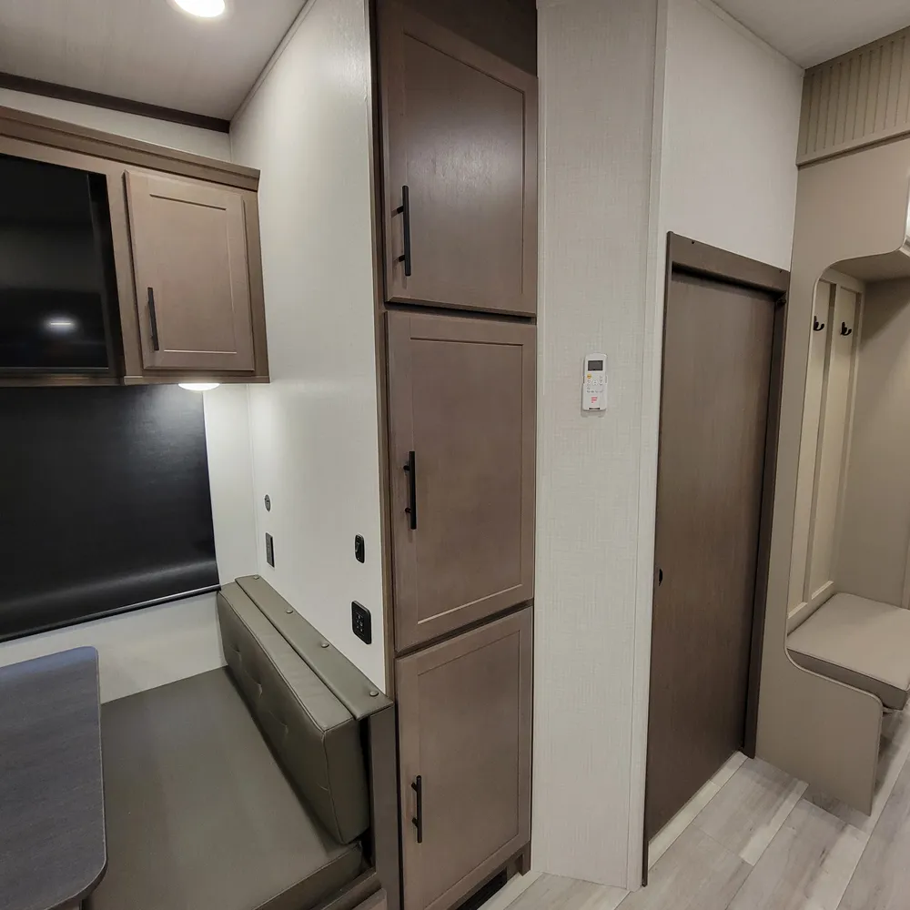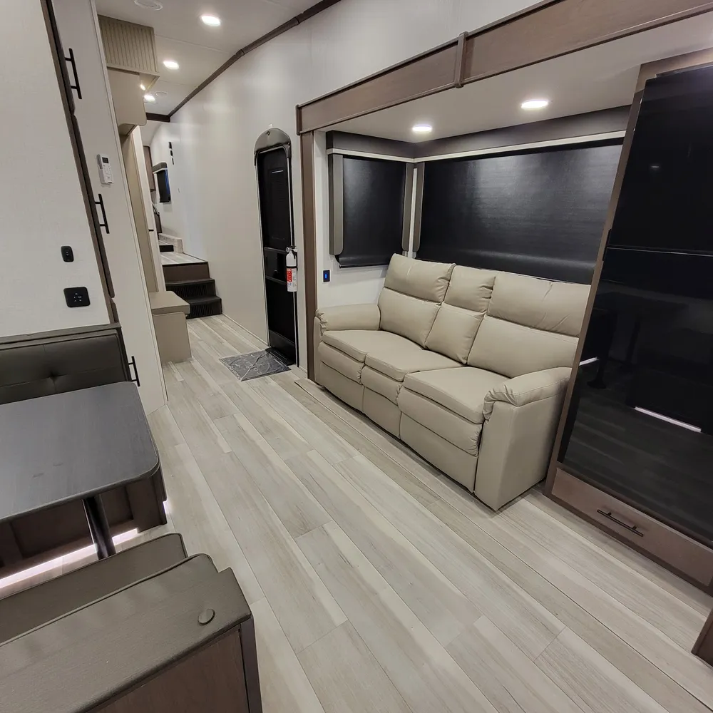 The mid-section features a completely redesigned double mid-bunk setup that maximizes sleeping space for kids or guests. The living area offers a booth dinette with drawer storage and accent lighting. along with theater seating that provides comfortable lounging space.