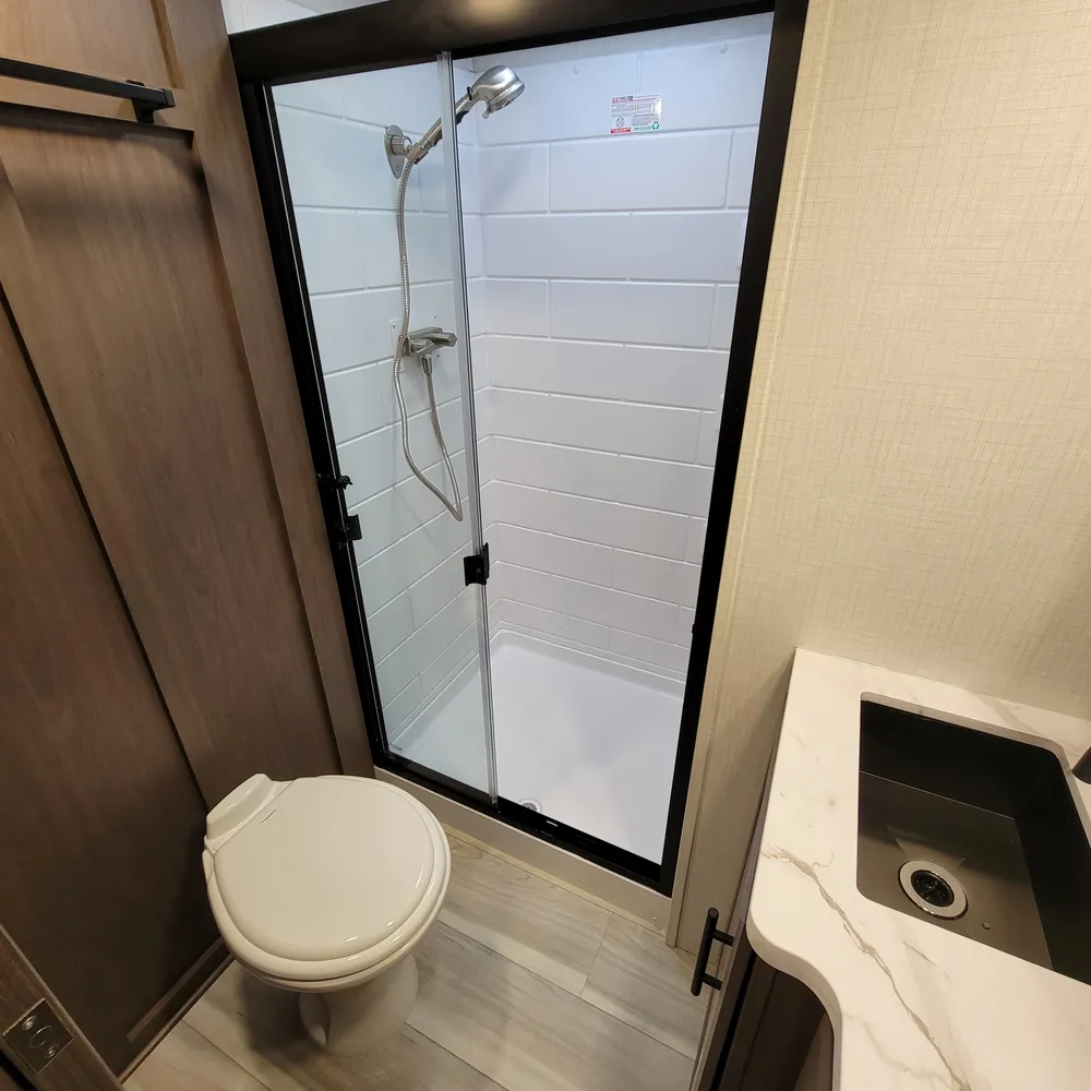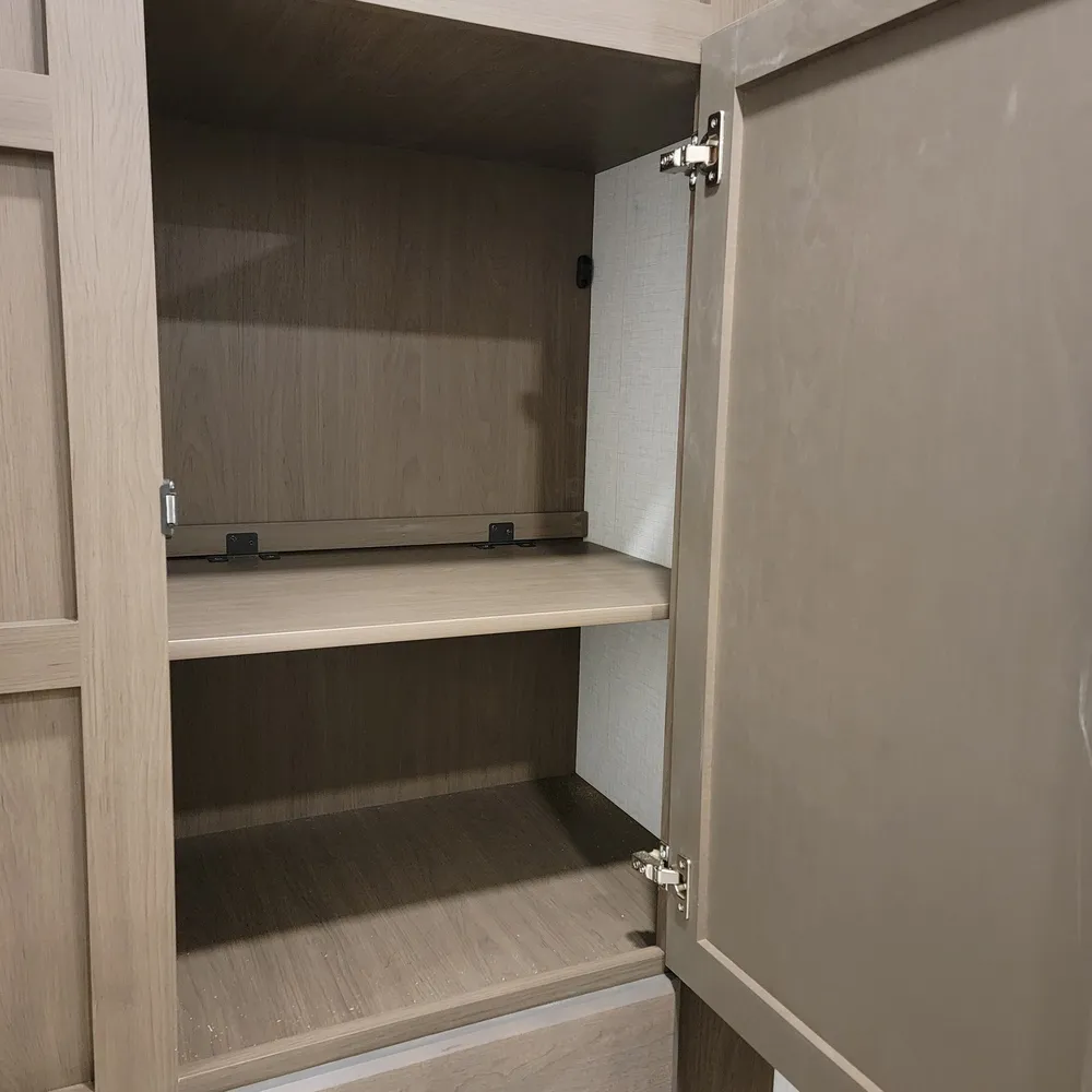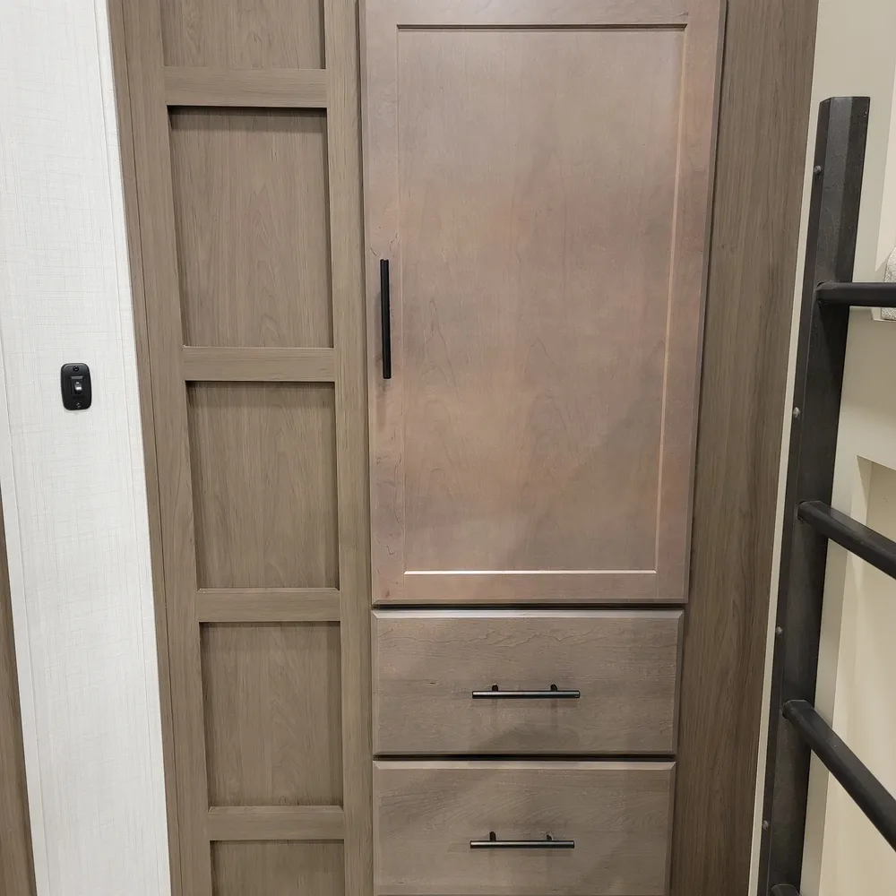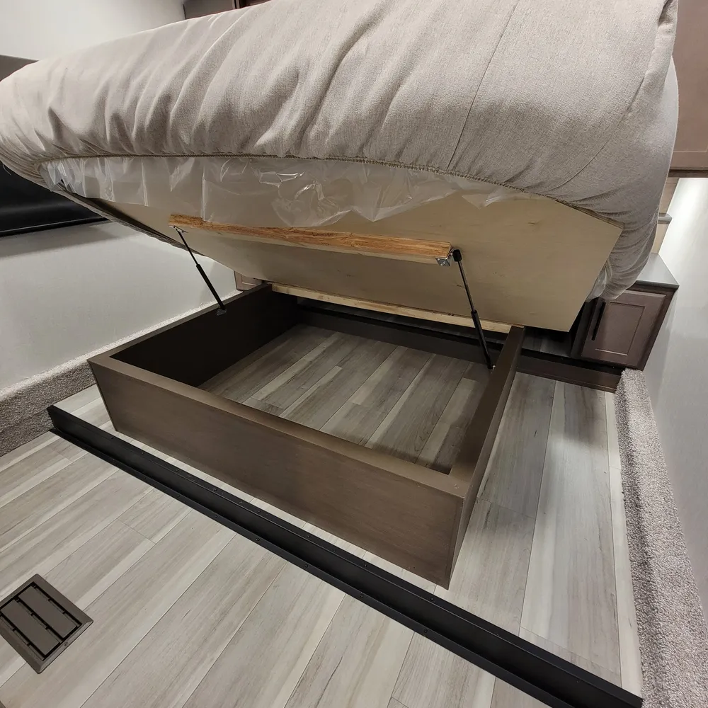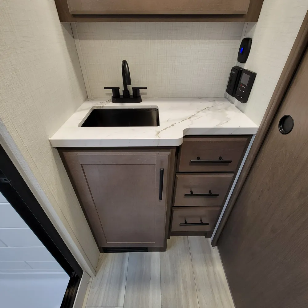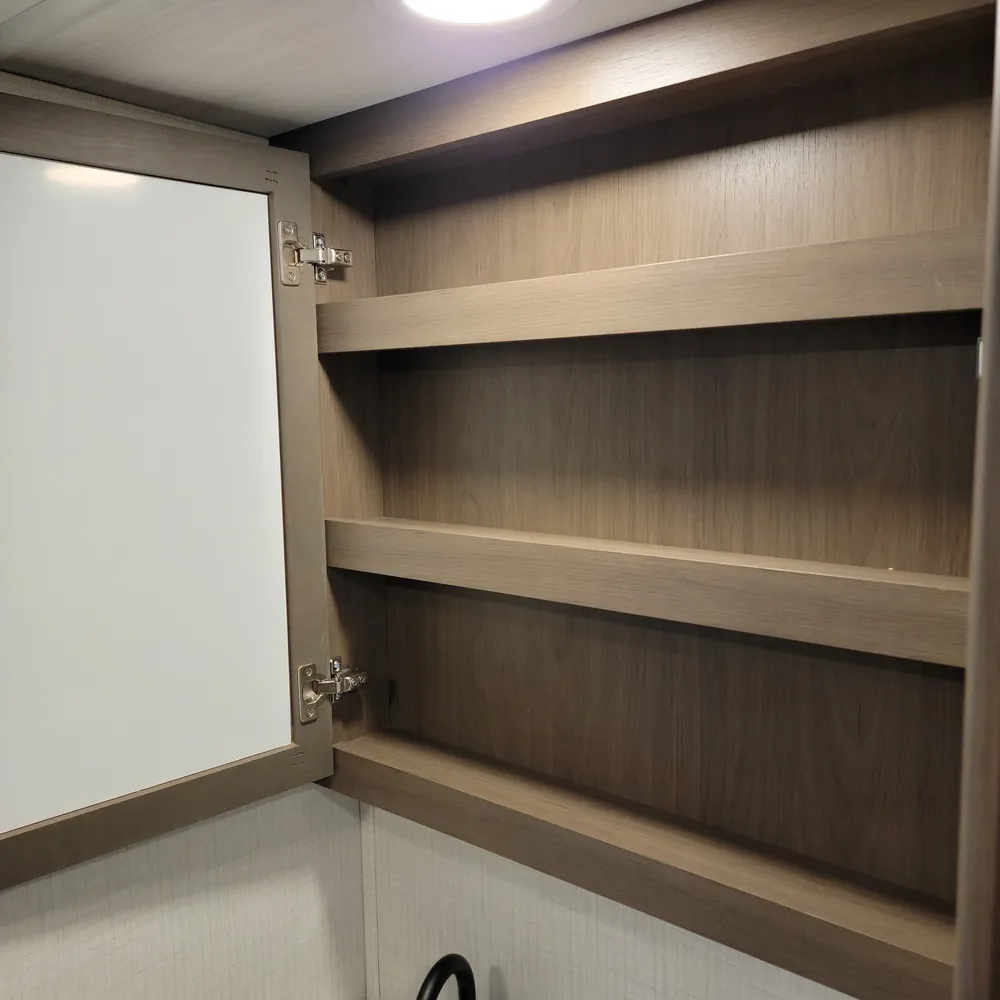 The mid-section features a completely redesigned double mid-bunk setup that maximizes sleeping space for kids or guests. The living area offers a booth dinette with drawer storage and accent lighting. along with theater seating that provides comfortable lounging space.