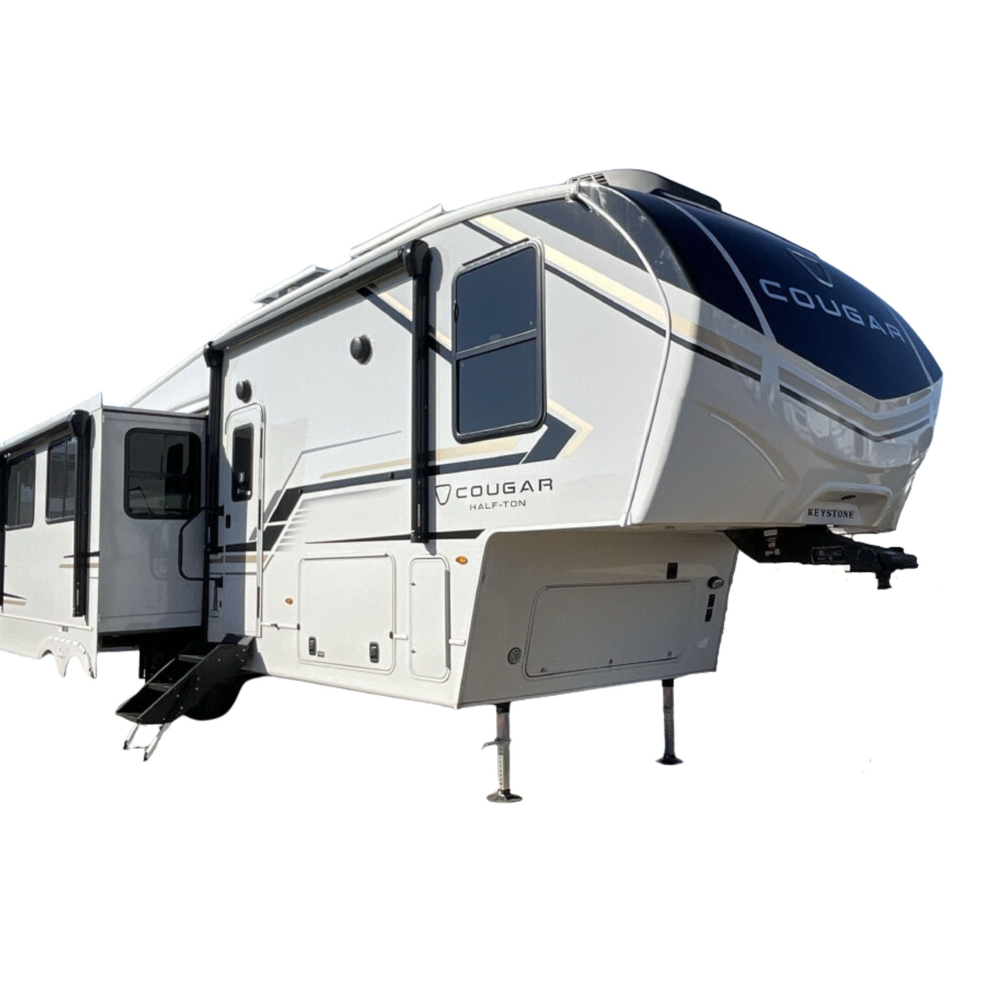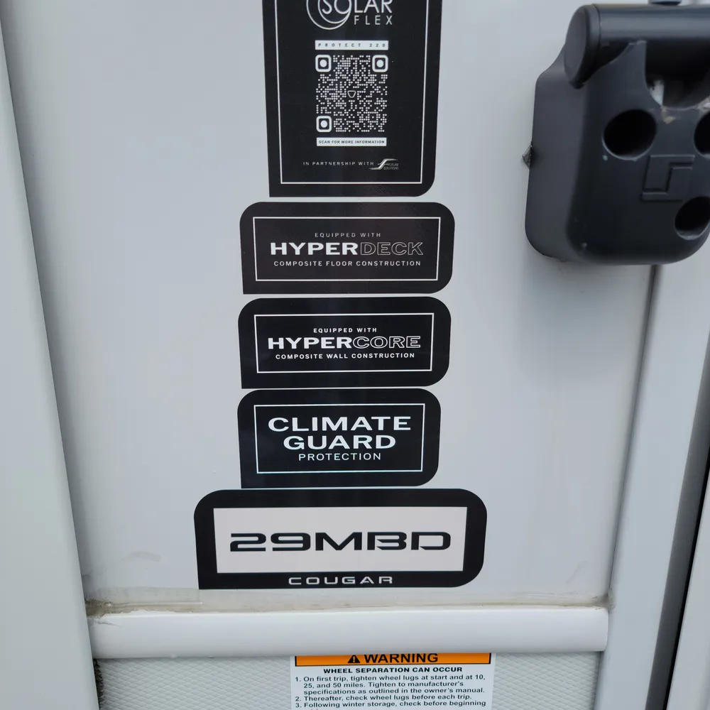 The 2026 Cougar Half-Ton 29MBD is a 34-foot fifth wheel that can sleep up to 10 people with its mid-bunk design making it ideal for families who want spacious sleeping arrangements and modern amenities in a half-ton towable package.