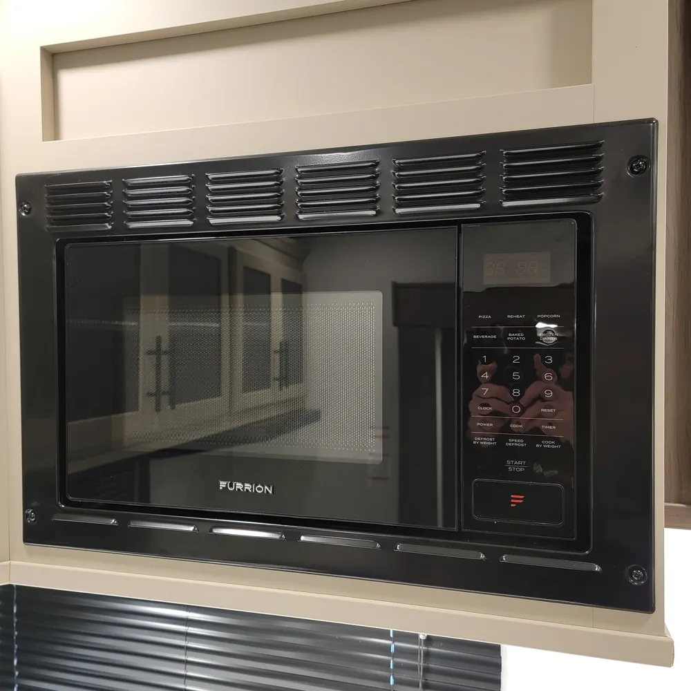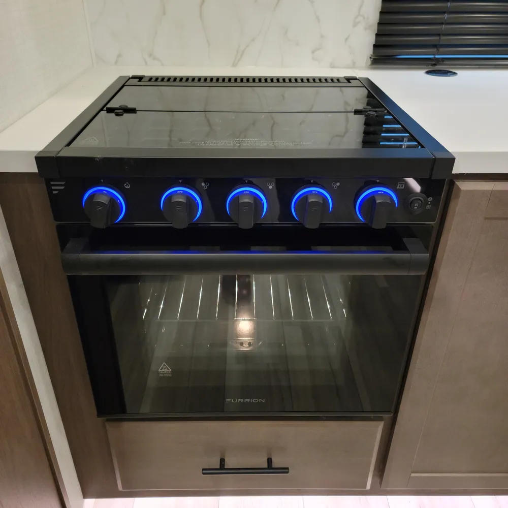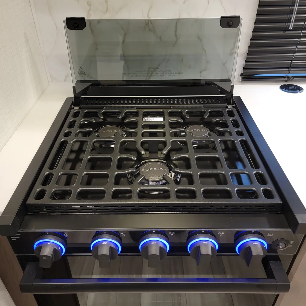 The rear of this fifth wheel showcases a well-equipped kitchen with a 10.6 cubic foot 12V refrigerator, 21-inch Furrion range with glass stovetop cover, and seamless pressed countertops.