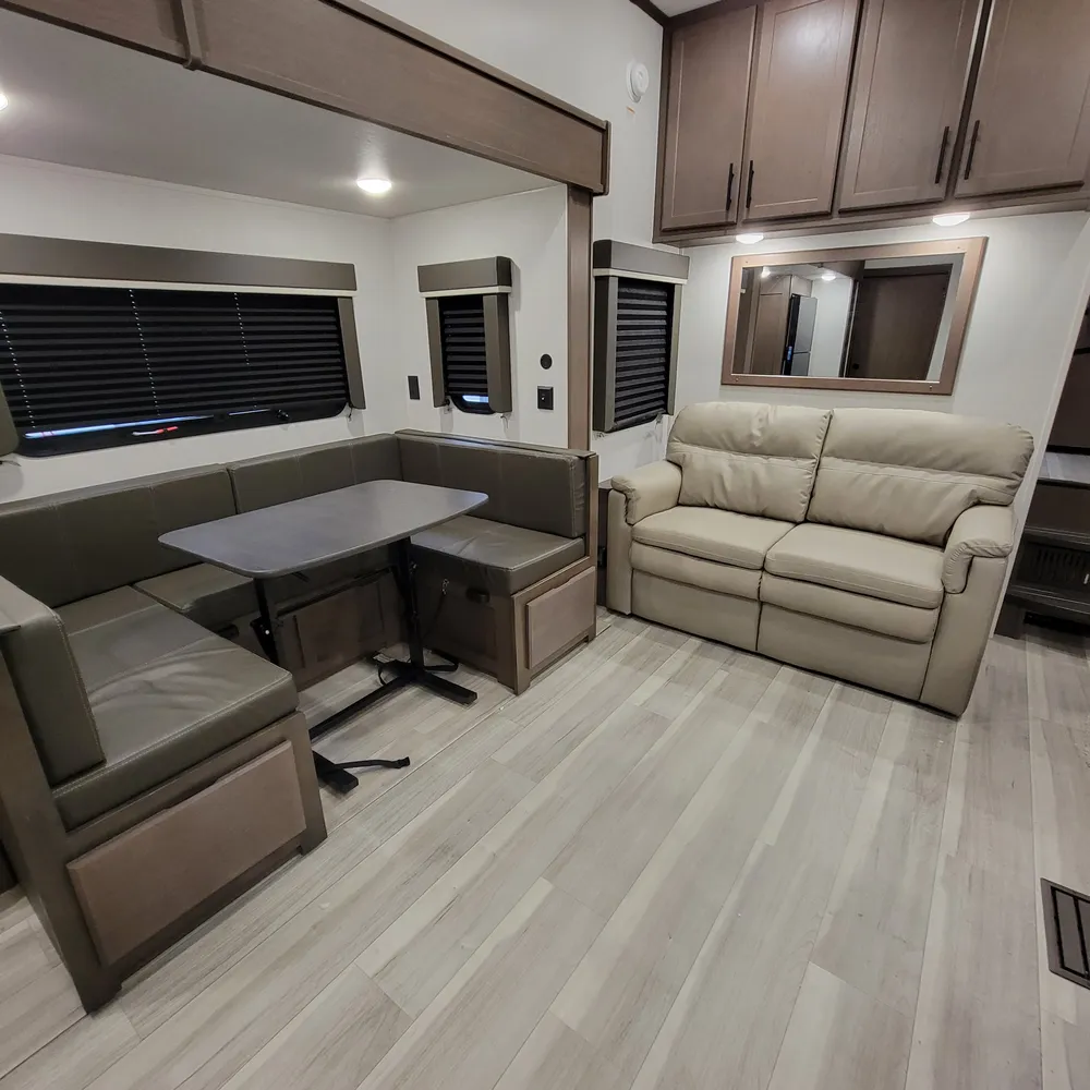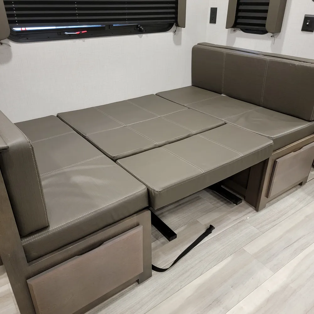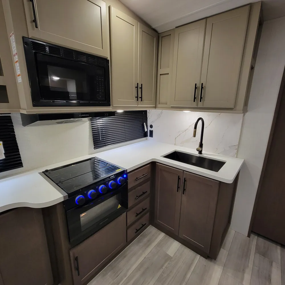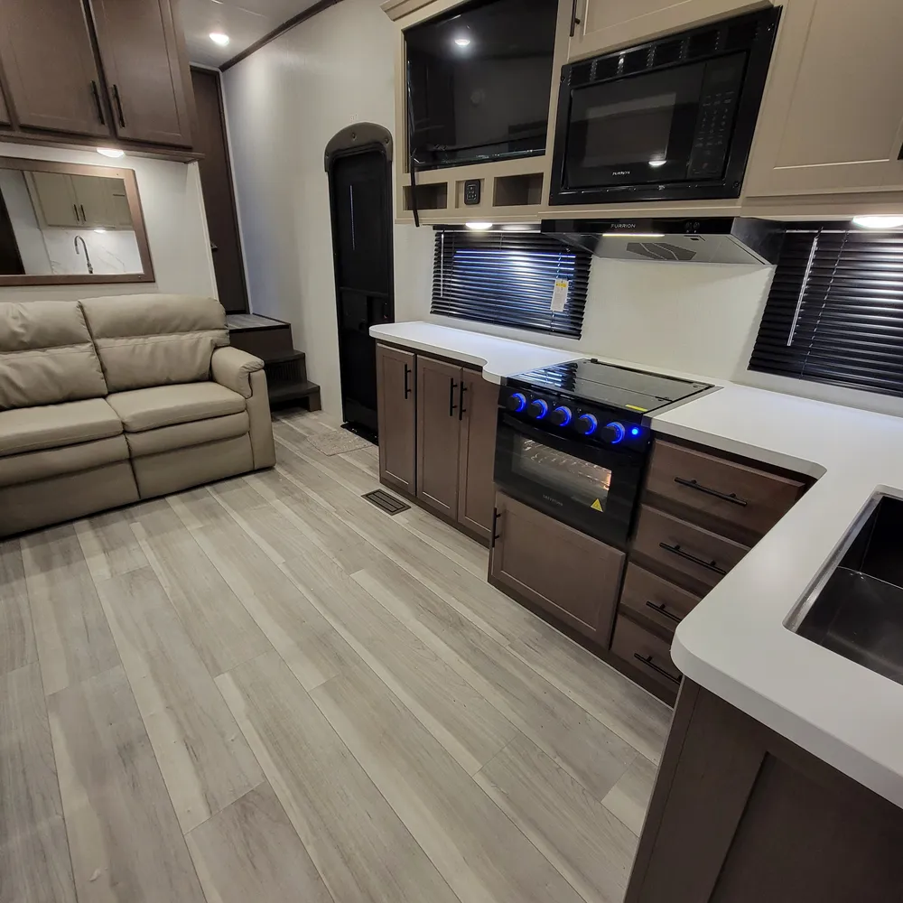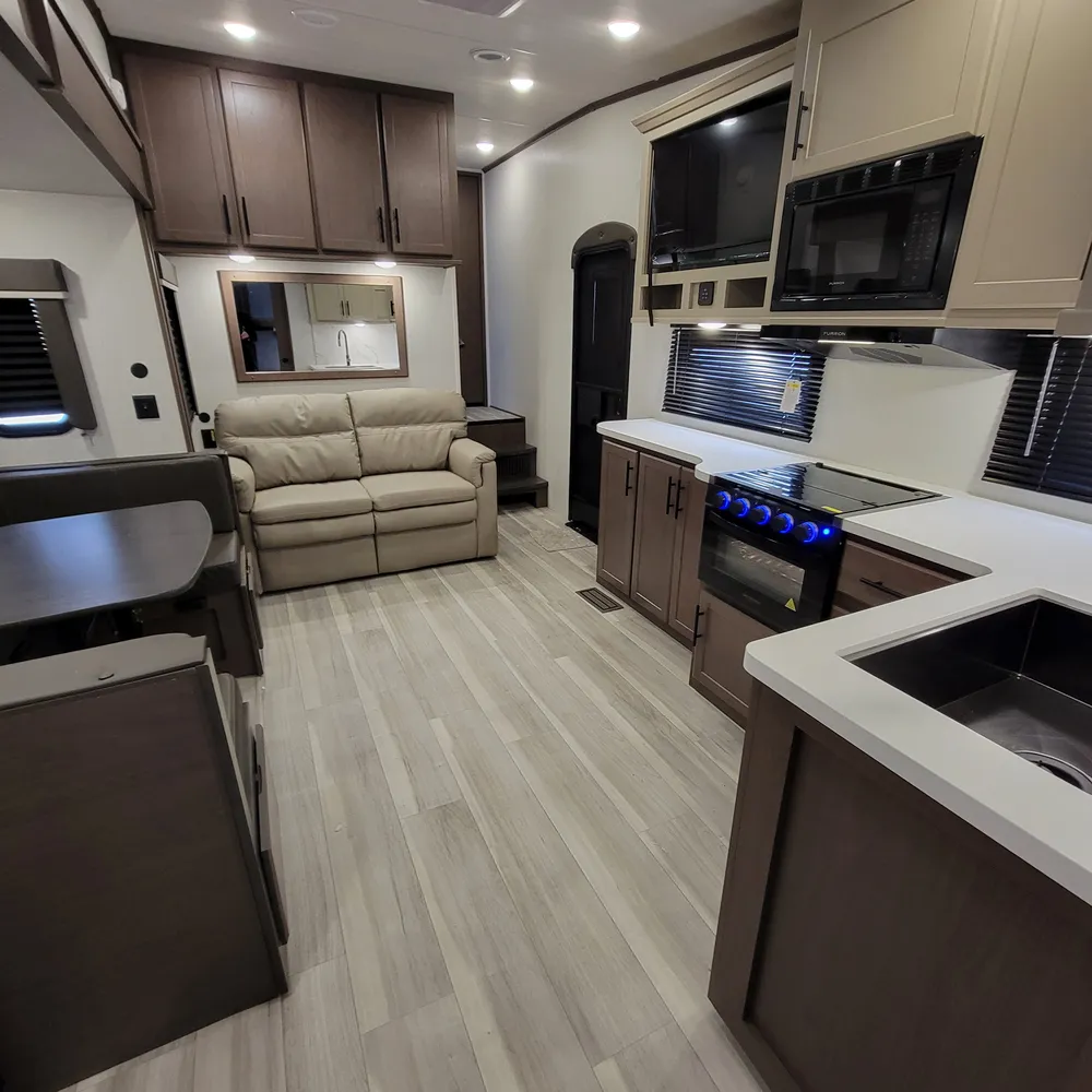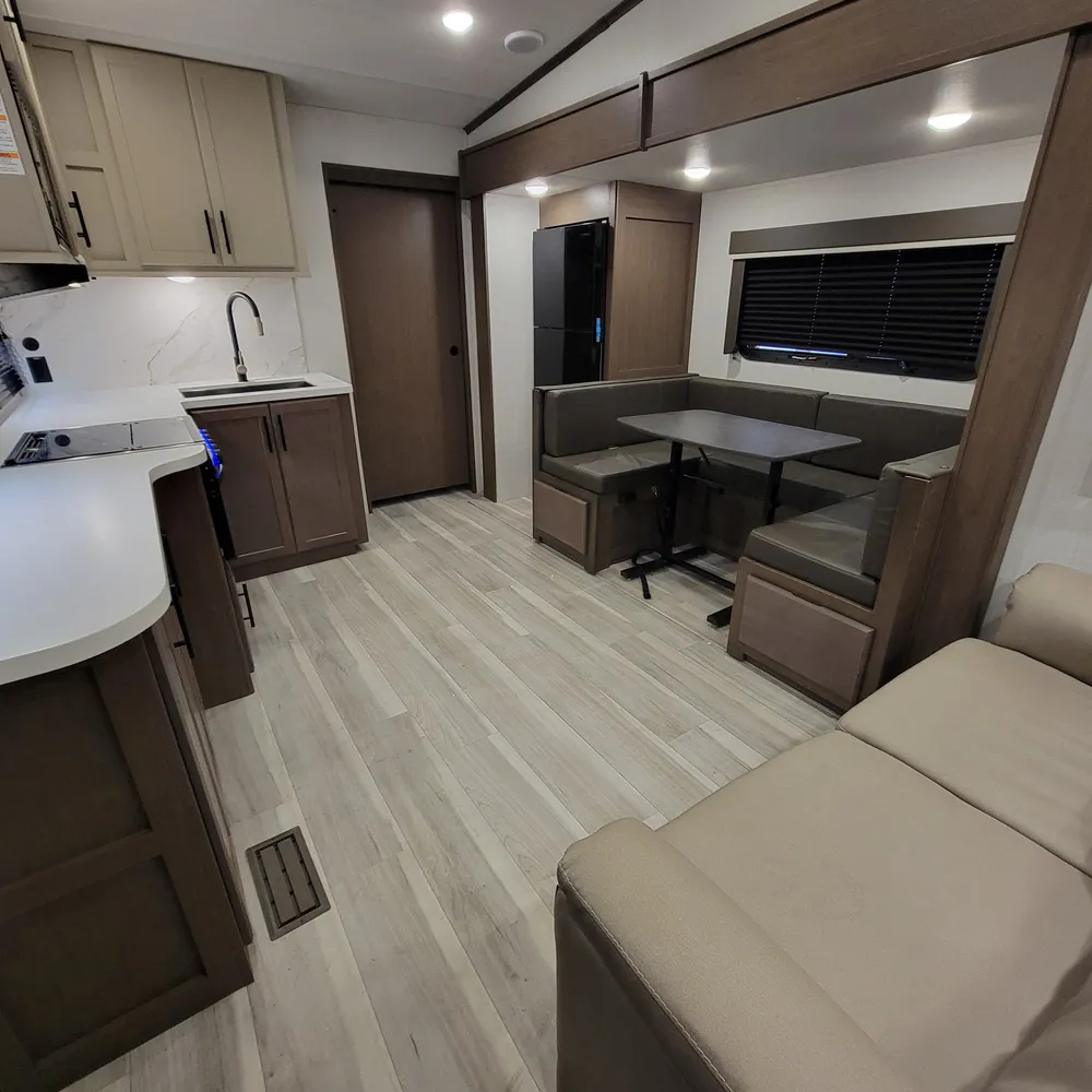 The 2700BH rear bunkhouse features triple double-bed bunks, sleeping up to six kids or guests in the private bunk room. The main living area includes a large U-shaped dinette and tri-fold sofa sleeper, both converting to additional sleeping space. Plush theatre seats face the 40″ LED TV with Bluetooth entertainment system and KeyTV multisource signal controller. The kitchen includes a 10.4 cu ft 12V refrigerator, 17″ range with glass cover, overhead microwave, and black stainless steel undermount sink with hi-rise faucet. Seamless pressed countertops and residential shaker-style hardwood cabinet doors create an upscale feel.