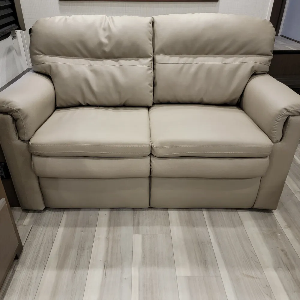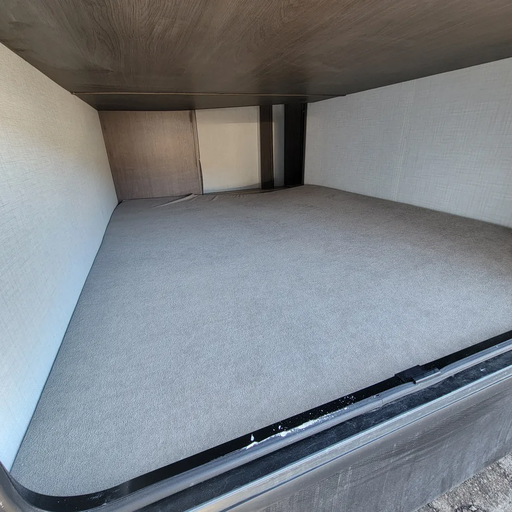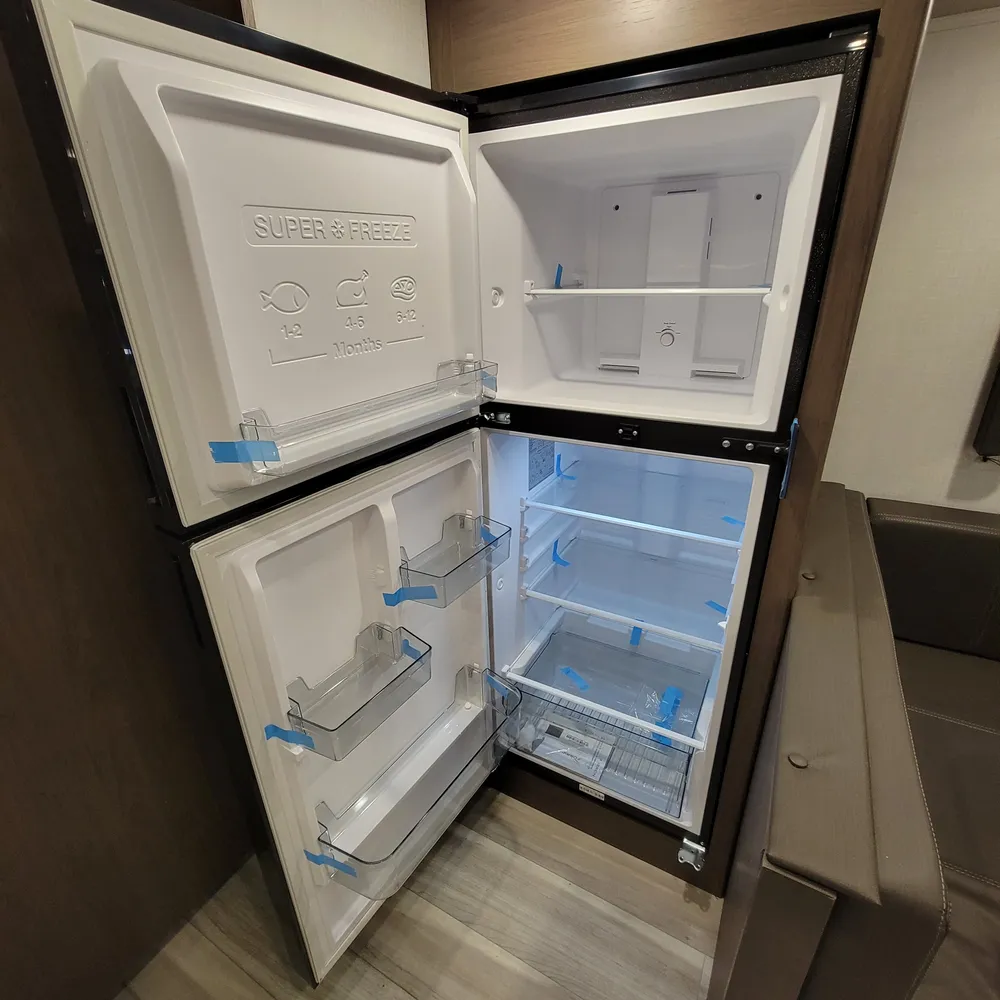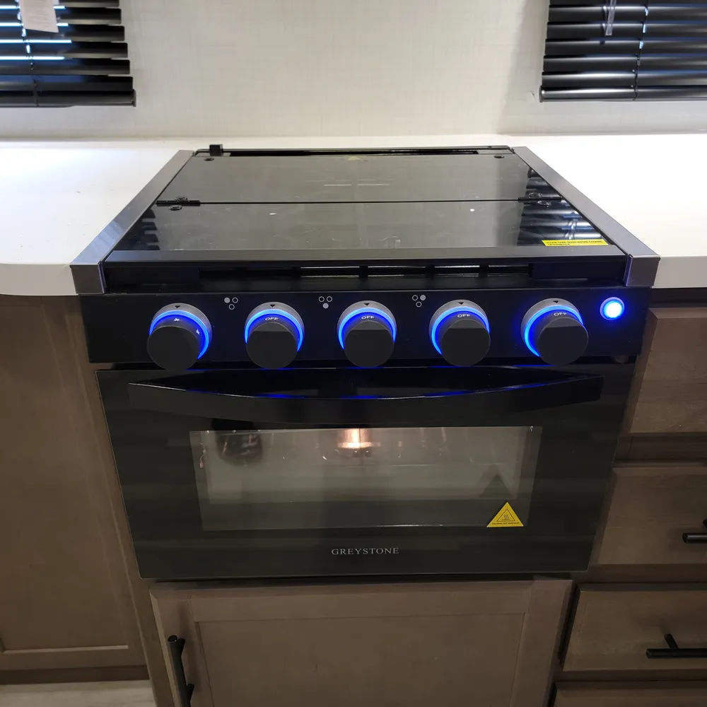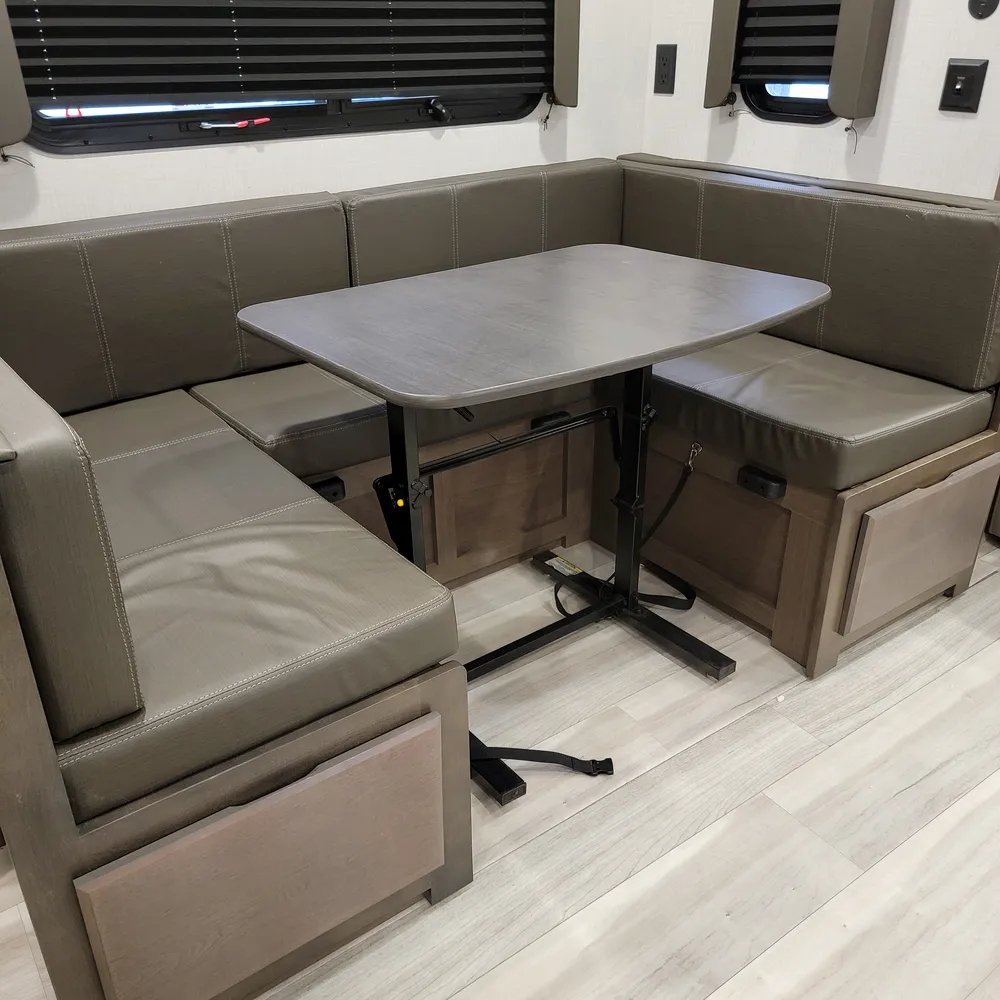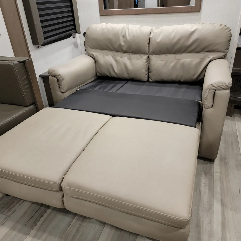 The 2700BH rear bunkhouse features triple double-bed bunks, sleeping up to six kids or guests in the private bunk room. The main living area includes a large U-shaped dinette and tri-fold sofa sleeper, both converting to additional sleeping space. Plush theatre seats face the 40″ LED TV with Bluetooth entertainment system and KeyTV multisource signal controller. The kitchen includes a 10.4 cu ft 12V refrigerator, 17″ range with glass cover, overhead microwave, and black stainless steel undermount sink with hi-rise faucet. Seamless pressed countertops and residential shaker-style hardwood cabinet doors create an upscale feel.