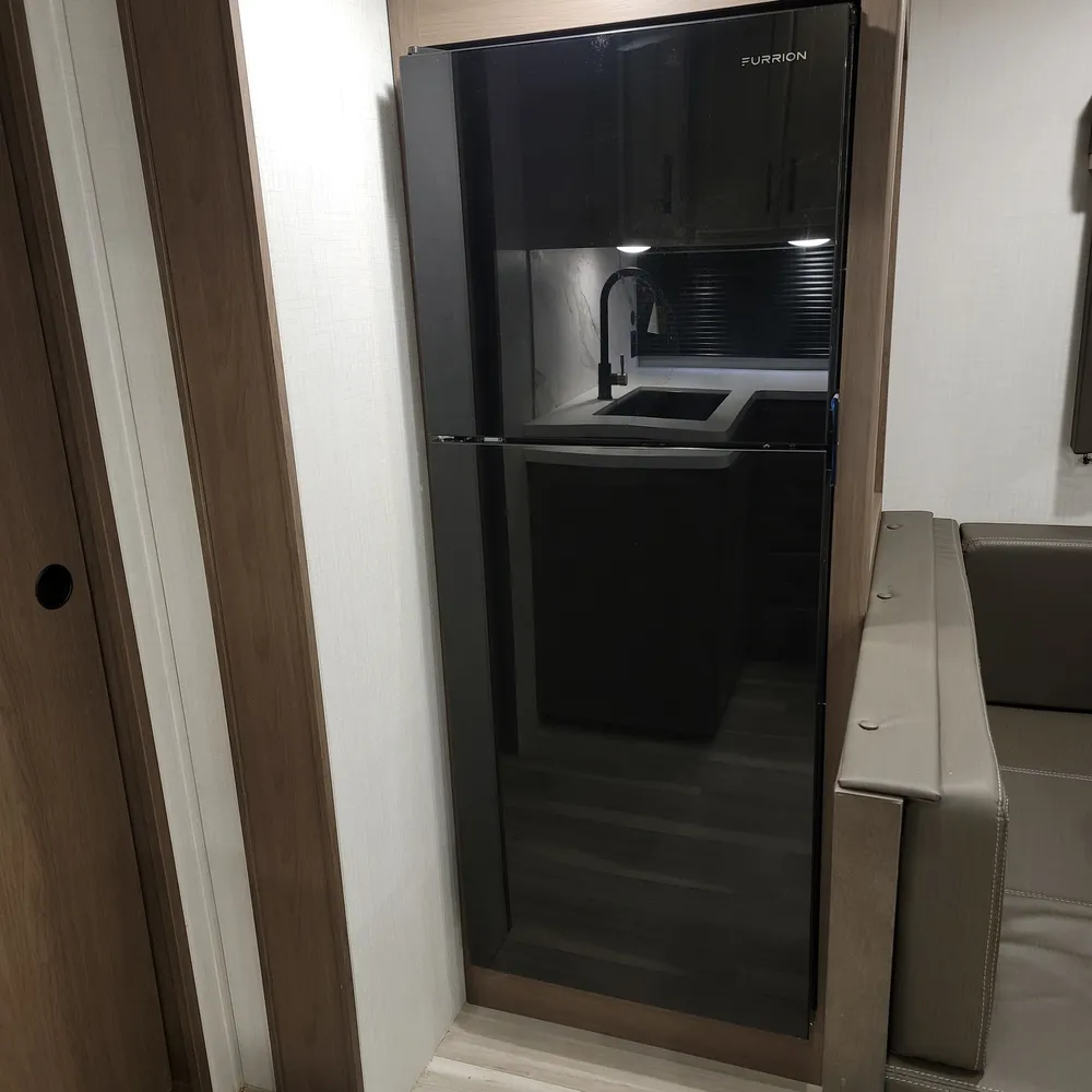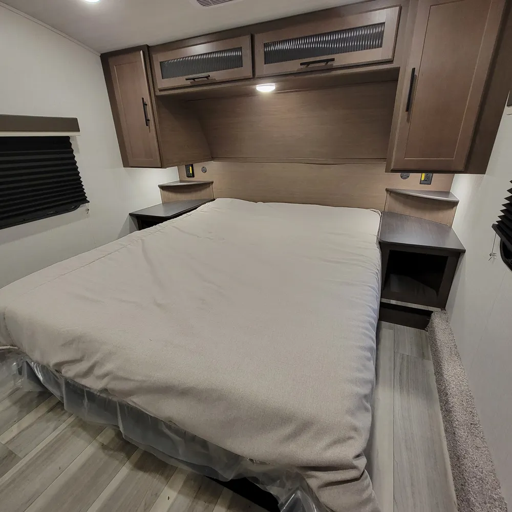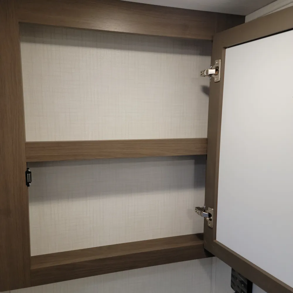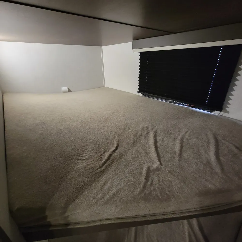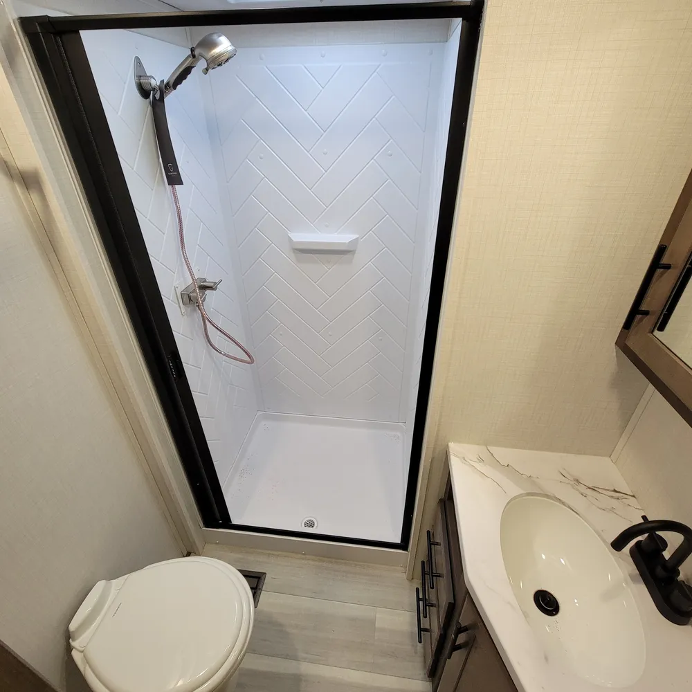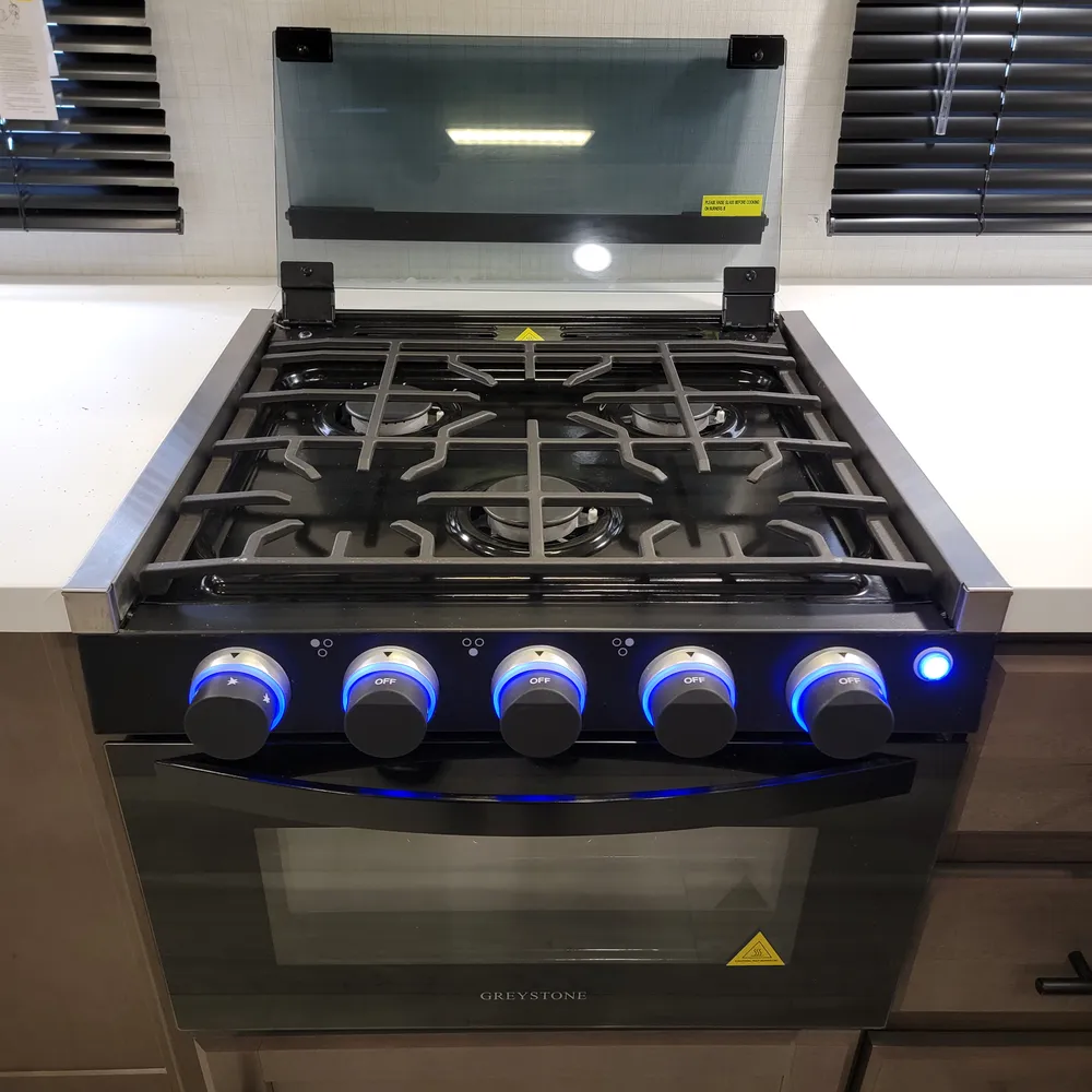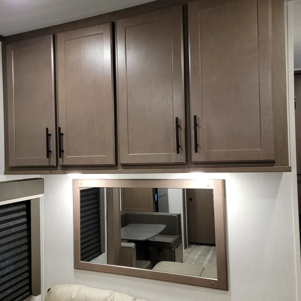 The 2700BH rear bunkhouse features triple double-bed bunks, sleeping up to six kids or guests in the private bunk room. The main living area includes a large U-shaped dinette and tri-fold sofa sleeper, both converting to additional sleeping space. Plush theatre seats face the 40″ LED TV with Bluetooth entertainment system and KeyTV multisource signal controller. The kitchen includes a 10.4 cu ft 12V refrigerator, 17″ range with glass cover, overhead microwave, and black stainless steel undermount sink with hi-rise faucet. Seamless pressed countertops and residential shaker-style hardwood cabinet doors create an upscale feel.