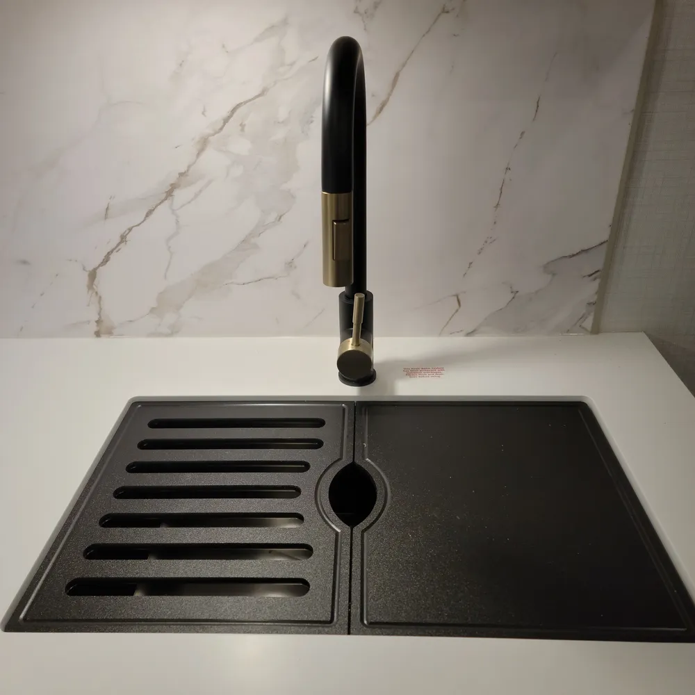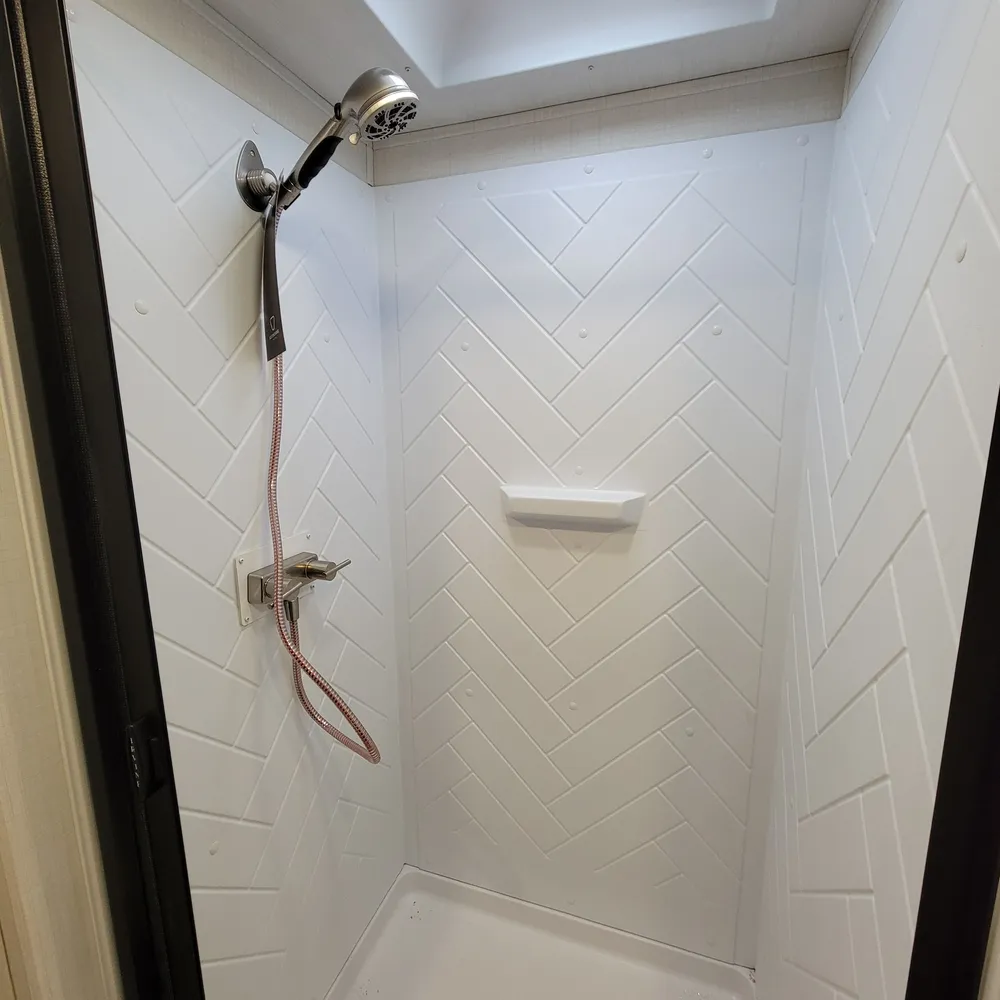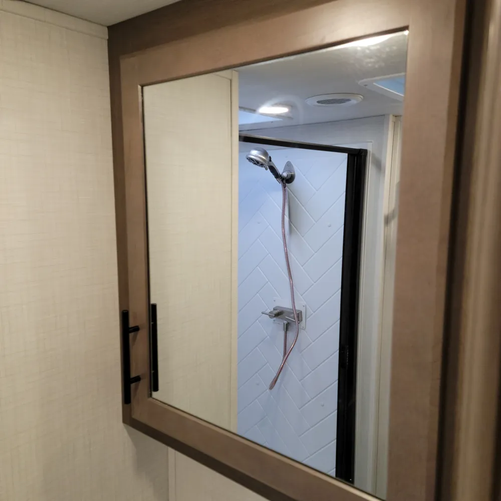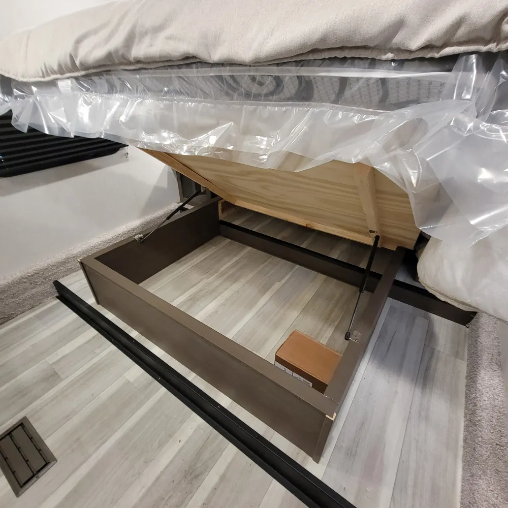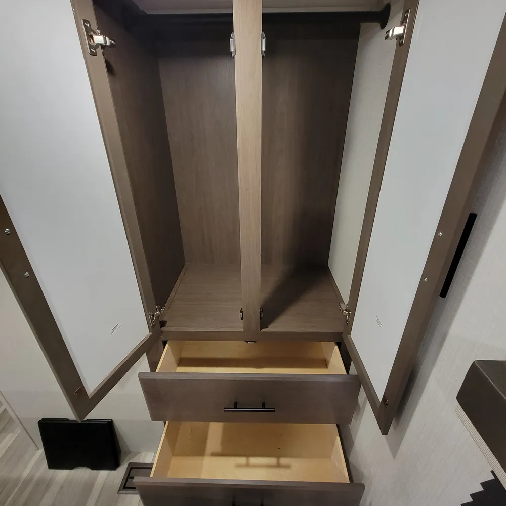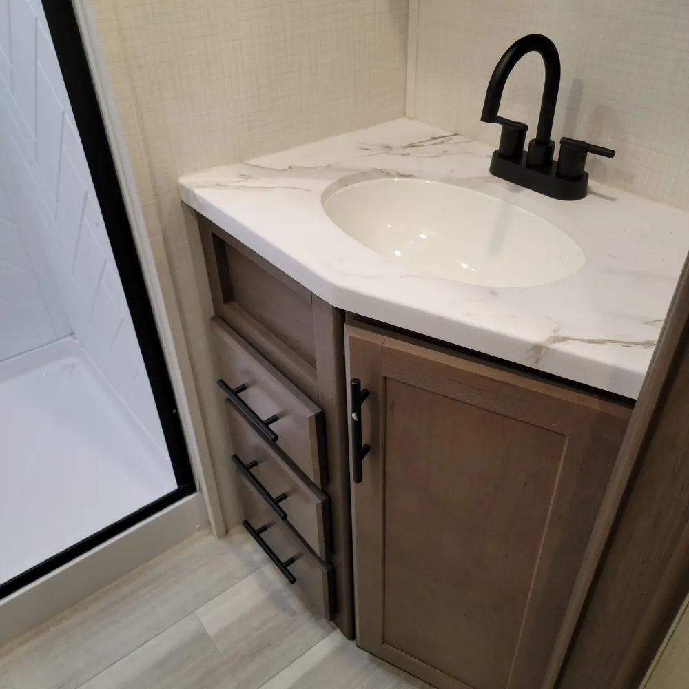 The 2700BH rear bunkhouse features triple double-bed bunks, sleeping up to six kids or guests in the private bunk room. The main living area includes a large U-shaped dinette and tri-fold sofa sleeper, both converting to additional sleeping space. Plush theatre seats face the 40″ LED TV with Bluetooth entertainment system and KeyTV multisource signal controller. The kitchen includes a 10.4 cu ft 12V refrigerator, 17″ range with glass cover, overhead microwave, and black stainless steel undermount sink with hi-rise faucet. Seamless pressed countertops and residential shaker-style hardwood cabinet doors create an upscale feel.