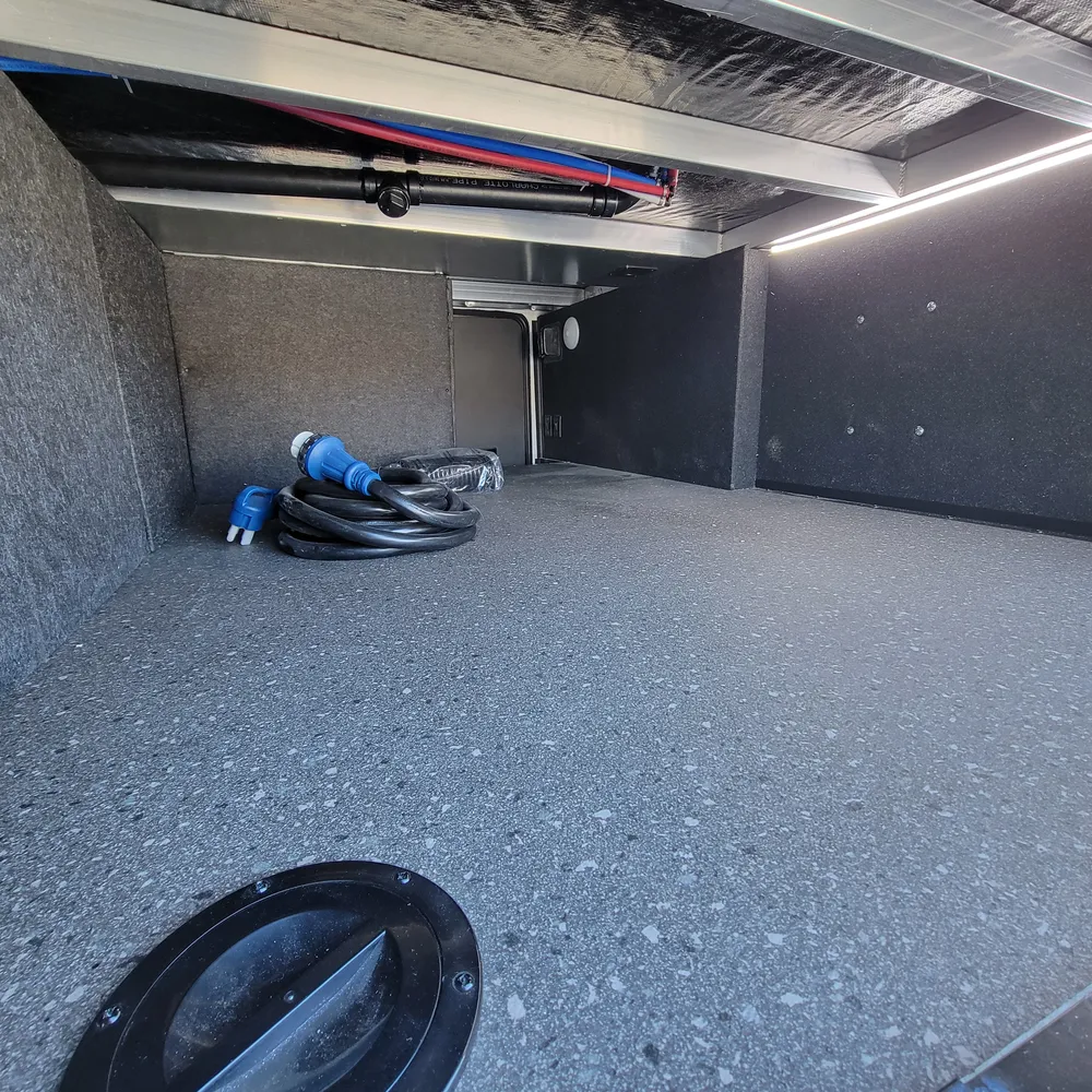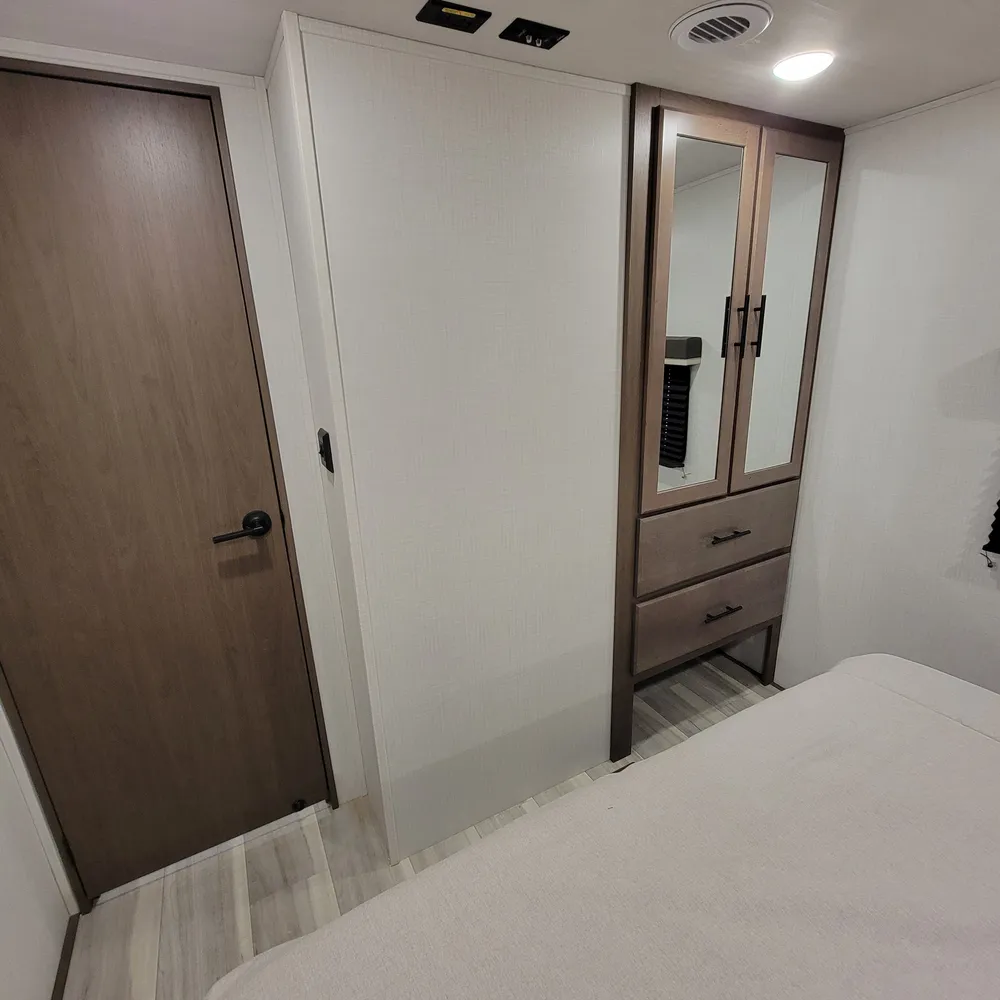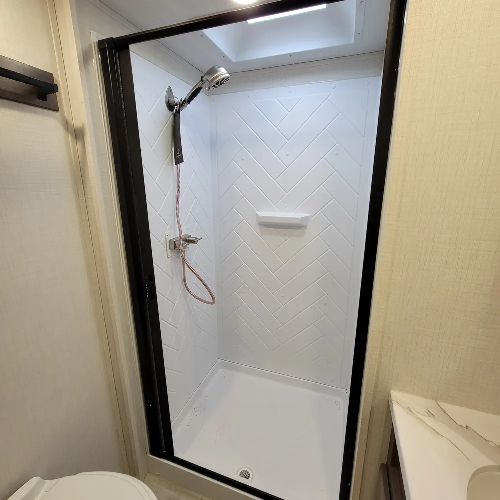 The private front bedroom features a queen bed with underbed storage, dual nightstands with LED reading lights, and full wardrobe with drawers. The bathroom includes a large shower with retractable door and skylight, porcelain foot flush toilet, and residential vanity with drawers. Full pass-through storage front and back provides massive gear capacity.