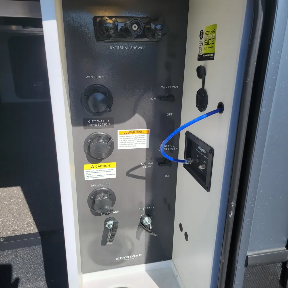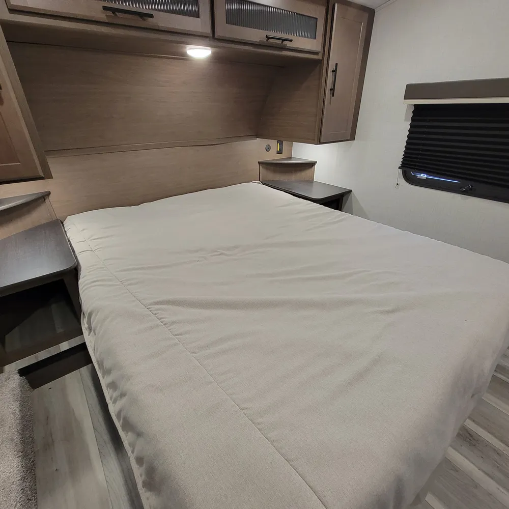 Built for comfortable camping, the Cougar Sport 2700BH PLATINUM includes dual 15,000 BTU ducted air conditioners, tankless water heater, and heated enclosed underbelly. The electric awning with LED lighting, campsite convenience center, and hot/cold exterior spray port extend your living space outdoors. Keystone’s HyperDeck composite flooring, HyperCore wall construction, MaxTurn technology, and color-coded 12V wiring deliver reliability. Heavy-duty 4,400 lb axles with ABS brakes and 10-ply E-rated tires ensure confident towing.