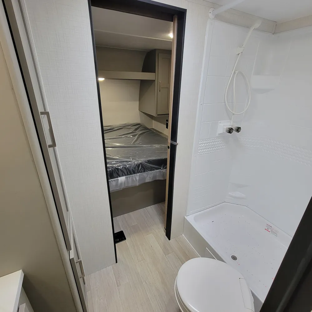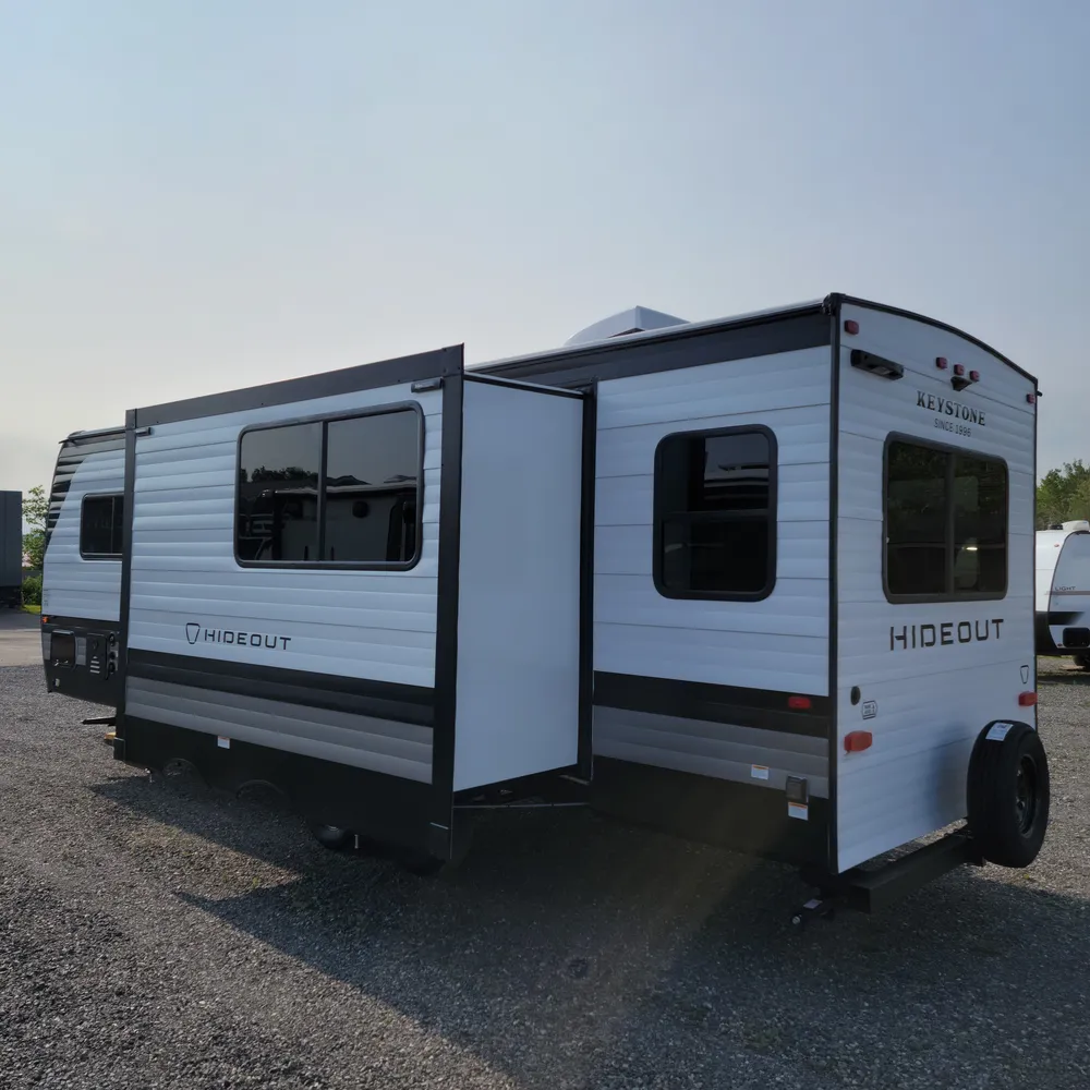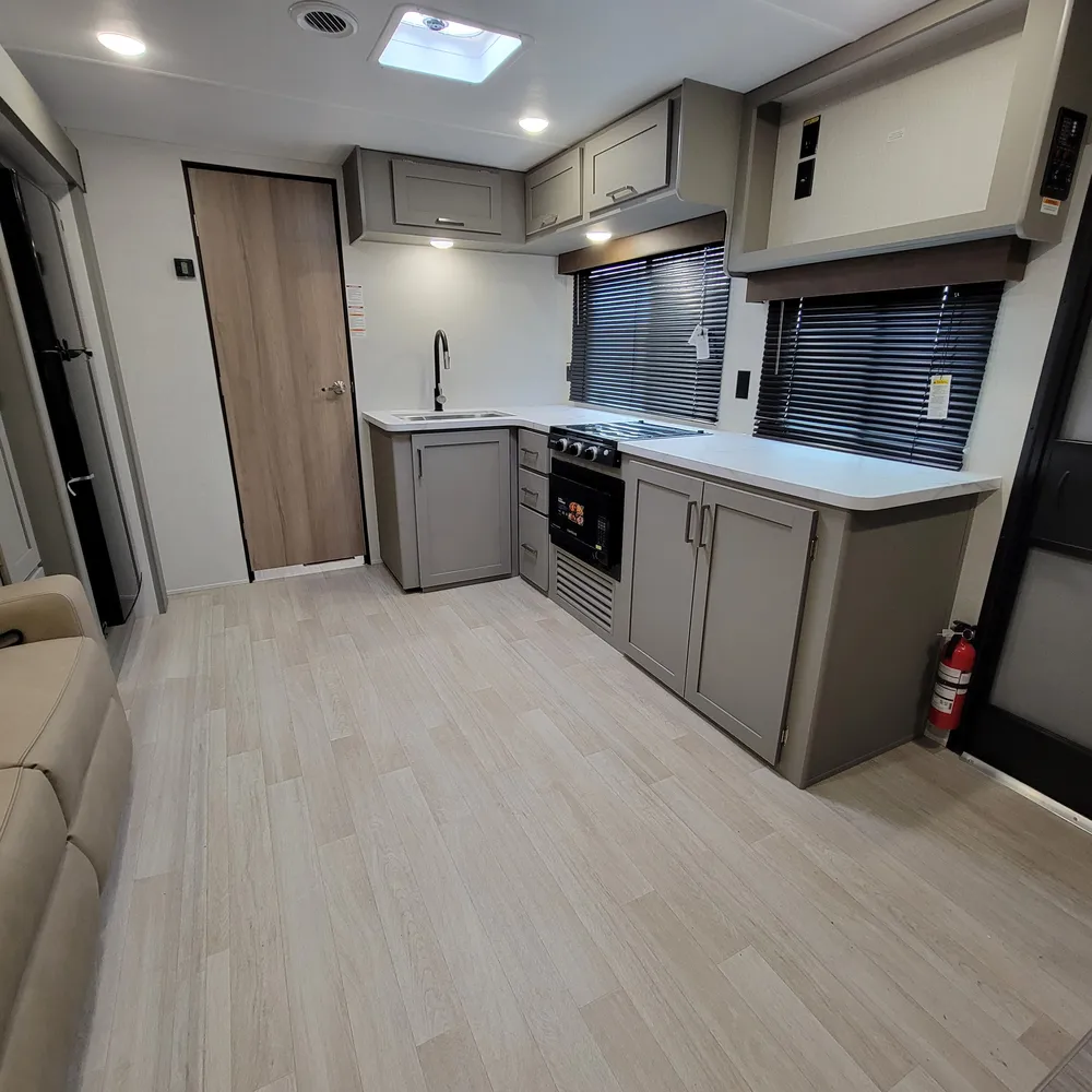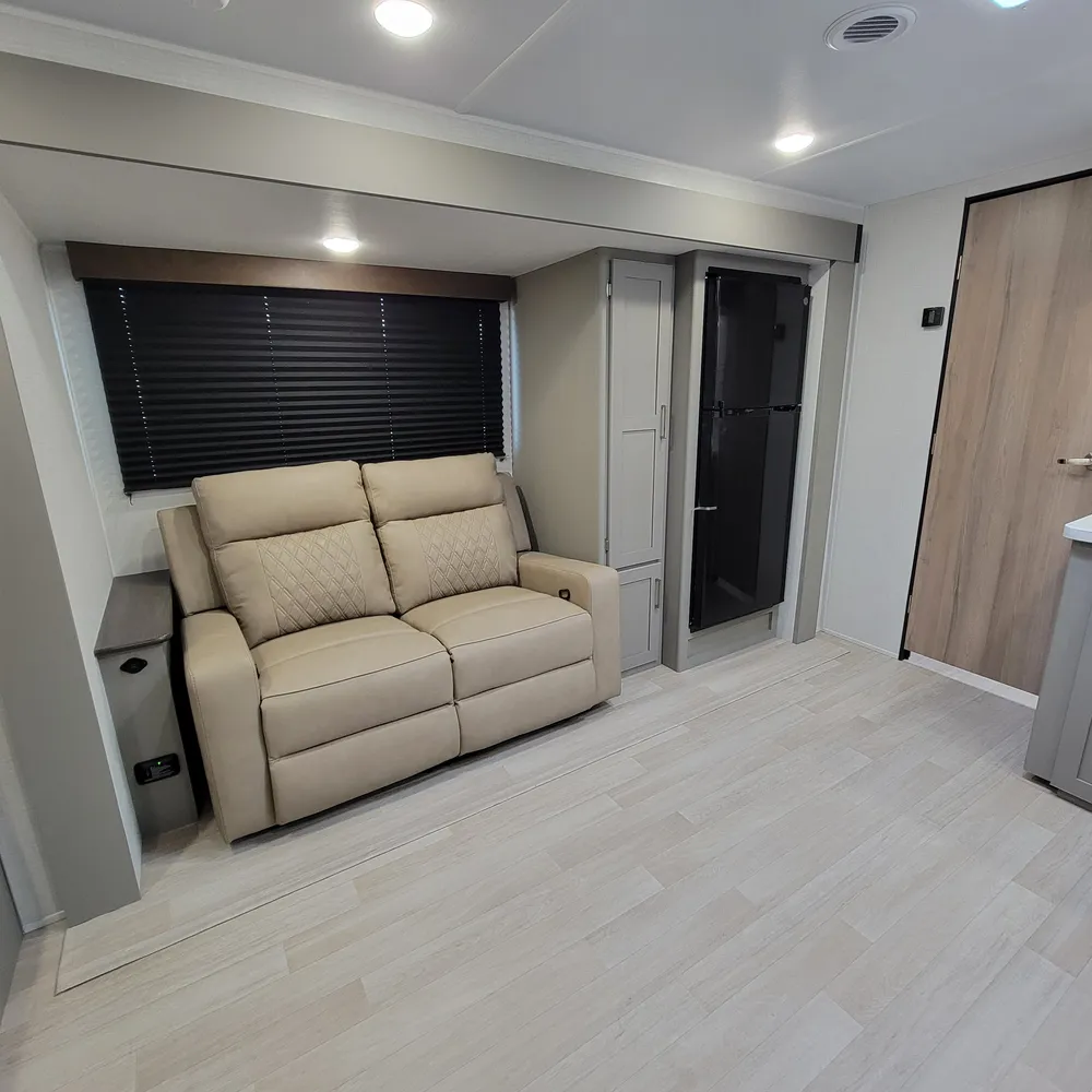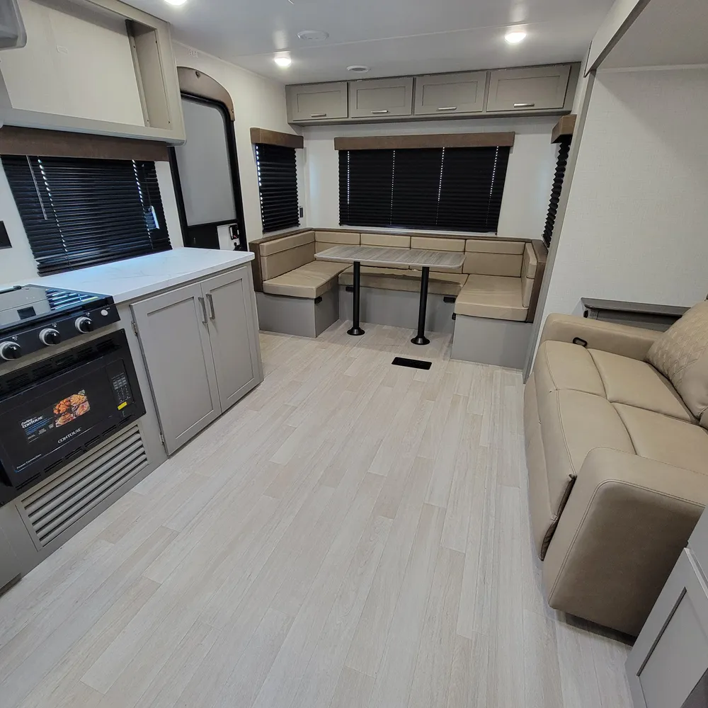 Vacations to your favorite places just got easier in this dual entry travel trailer. You can enter in through the rear living area or the front master bedroom after a tiring day. The camp cook can make meals on the three burner gas cooktop, while the others gather around the rear U-shaped dinette. There is also a sofa slide out for additional seating spaces, and both of these pieces of furniture will double as your guests’ sleeping space at night.