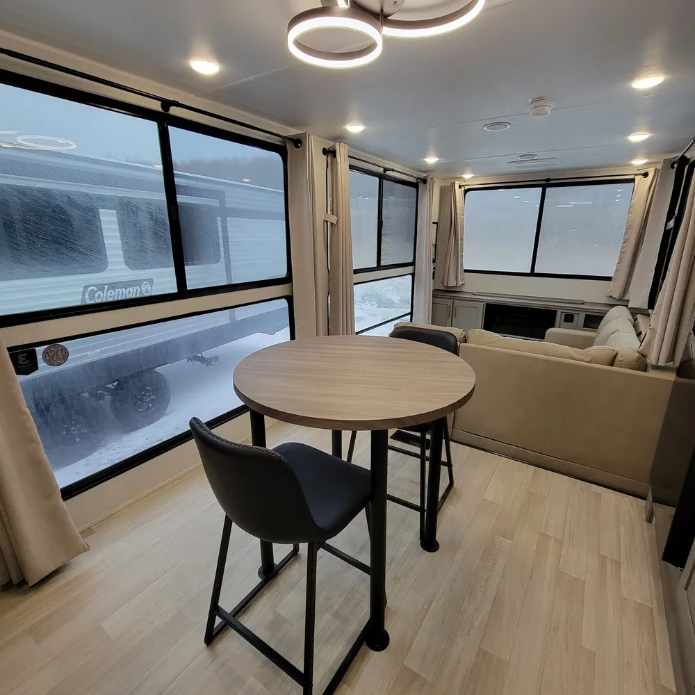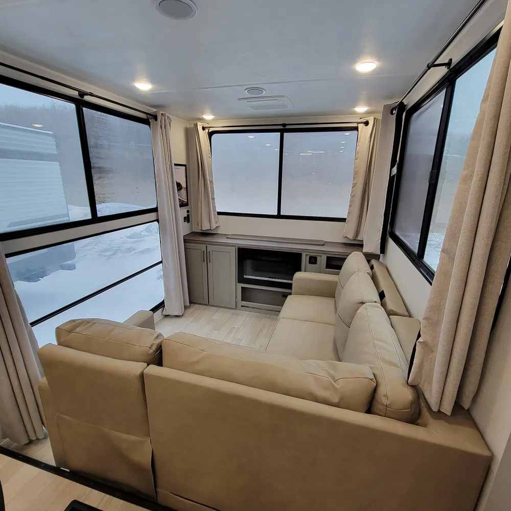 The 31SUNROOM’s rear living area features an L-shaped lounge, electric fireplace, and 50-inch smart TV. The three-sided window design floods the space with natural light while providing exceptional campground views offering a truly unique camping experience.