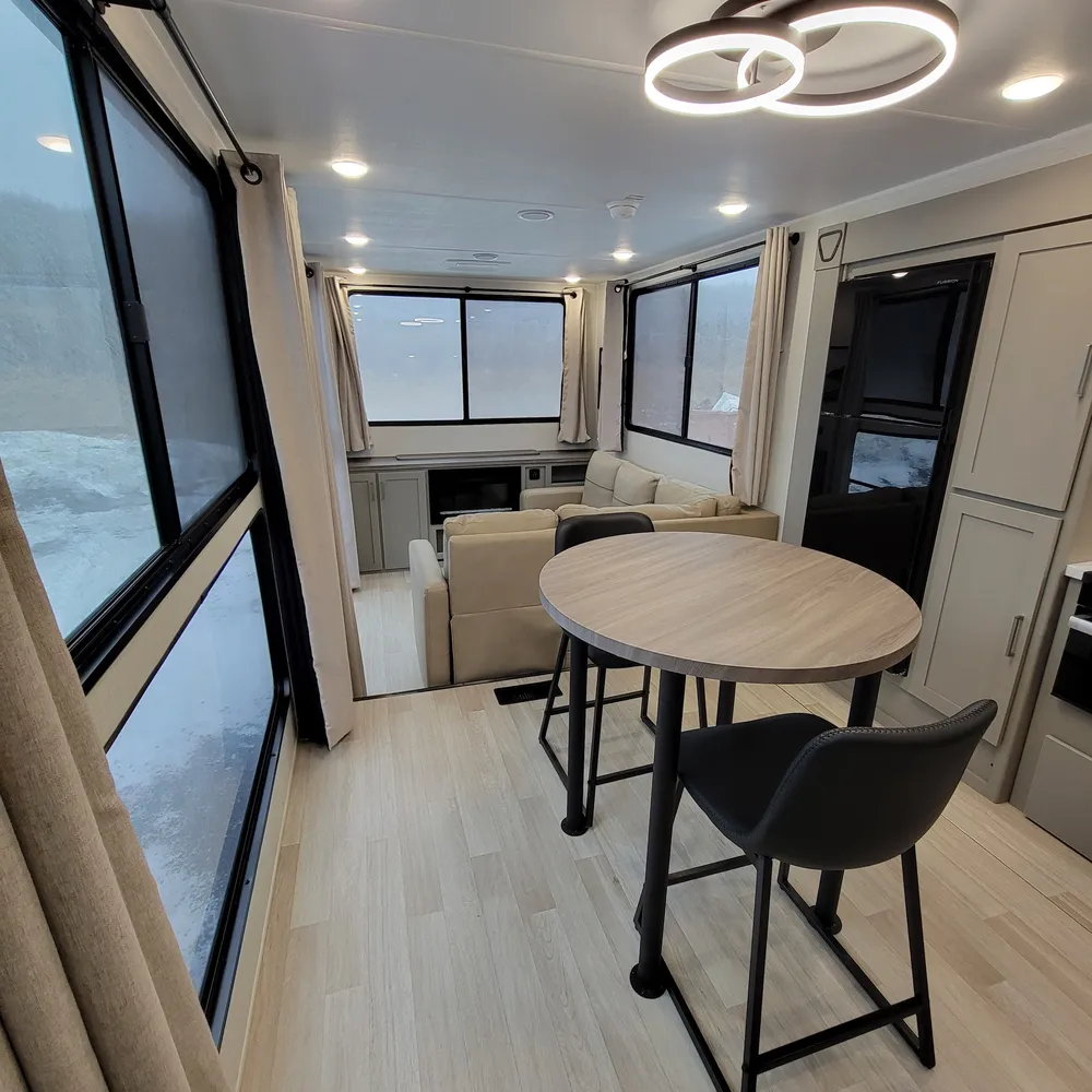 The kitchen comes equipped with a residential-style refrigerator, microwave with air fryer function, three-burner stove, and ample counter space. A round bistro-style table adds an elegant touch rarely found in travel trailers. The primary bedroom features a queen bed, twin wardrobes, overhead cabinets, and additional storage, with a dedicated second air conditioning unit for climate control.