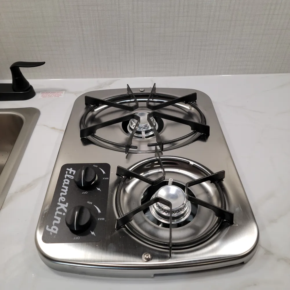 Inside this ultra-lightweight and nimble travel trailer, you will find all the essentials for a comfortable getaway: a convenient kitchenette with a 2-burner cooktop and microwave, a modern tankless water heater, and sleeping space perfect for two.